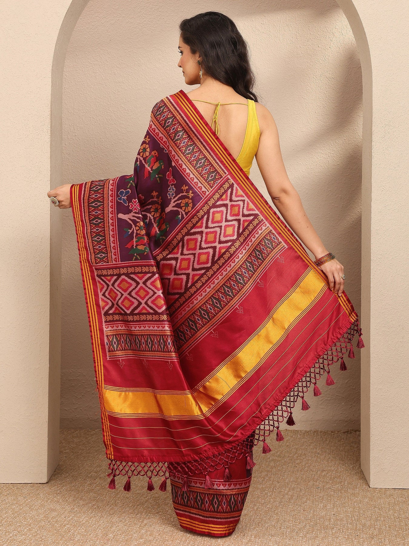 Our maroon printed silk blend saree features captivating floral and geometric patterns. Complemented with a Unstitched blouse piece.. This charming saree is perfect for festive occasions.