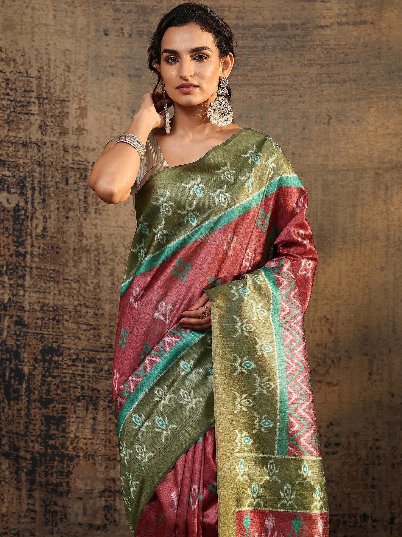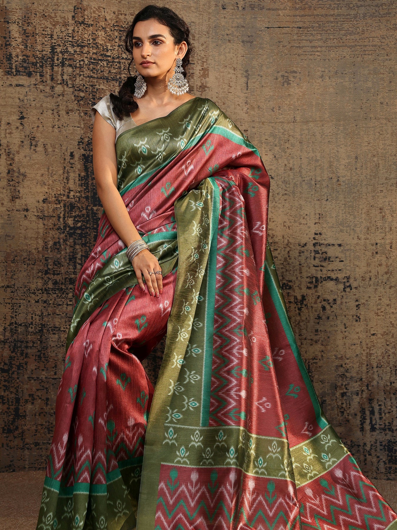 Green Ikat Printed Silk Saree With Unstitched Blouse Piece