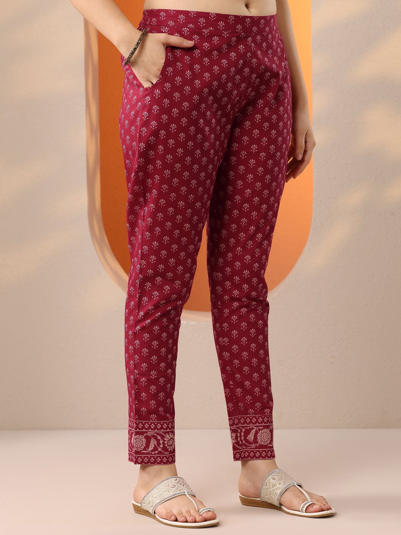 Our 2-piece maroon cotton Anarkali features a round neckline, regular sleeves, and a statement yoke. Complemented with straight pants with a partially elasticated waistband and 2 pockets. Adorned with floral prints, this style is perfect for dark festive occasions.