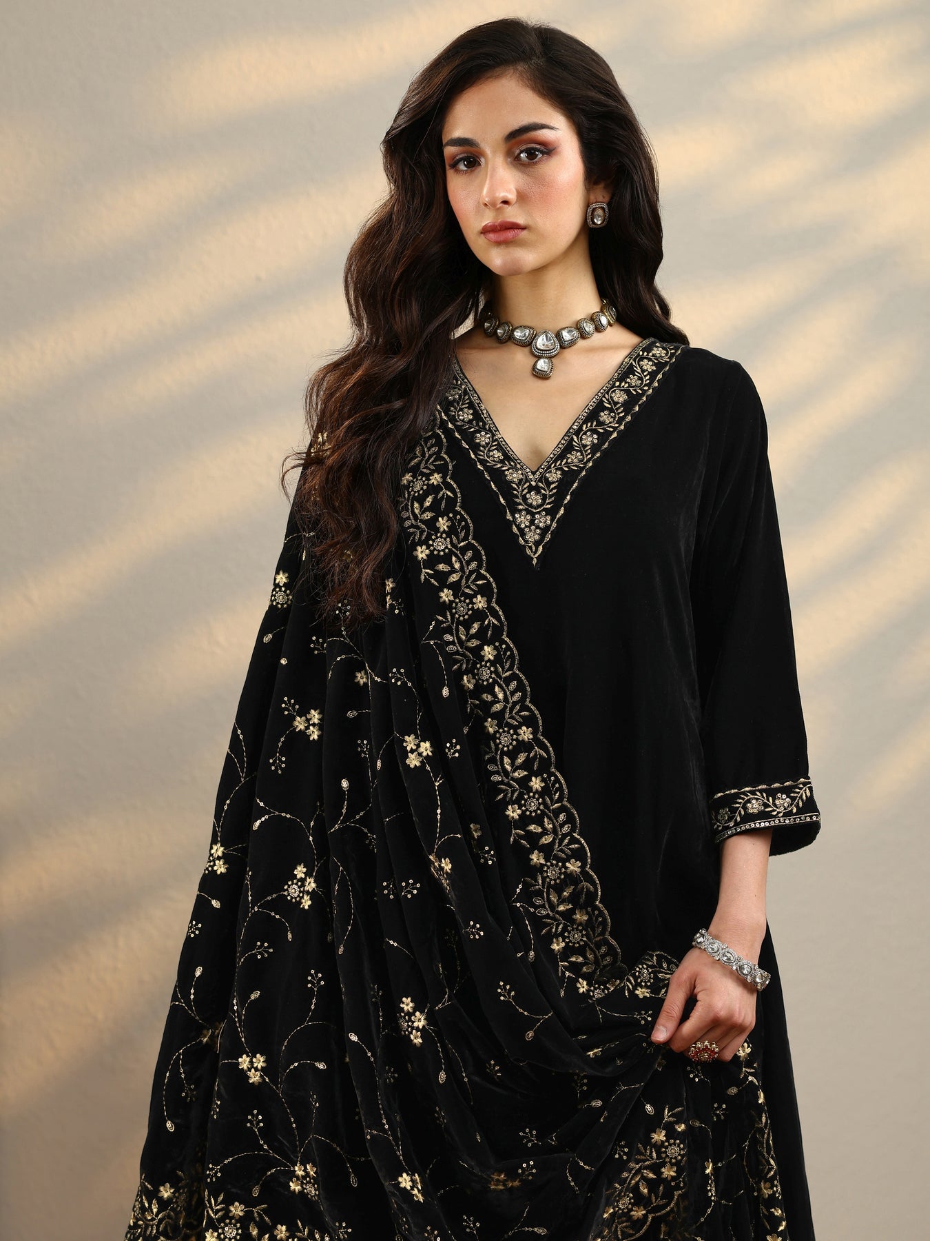 Black Yoke Design Velvet A-Line Kurta With Trousers & Dupatta