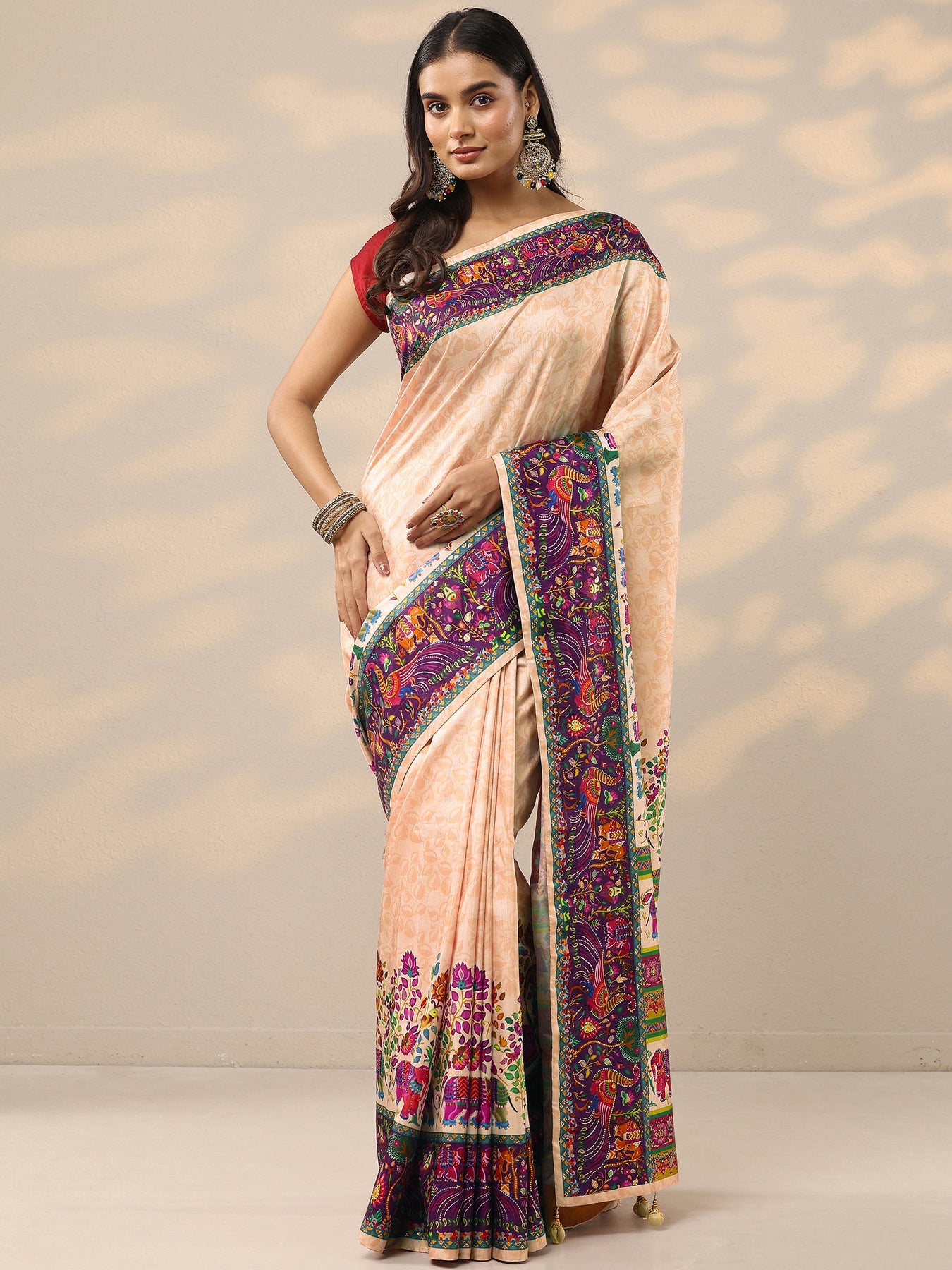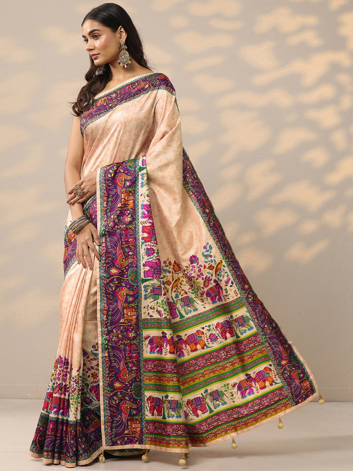 Gold Printed Silk Blend Saree With Unstitched Blouse Piece