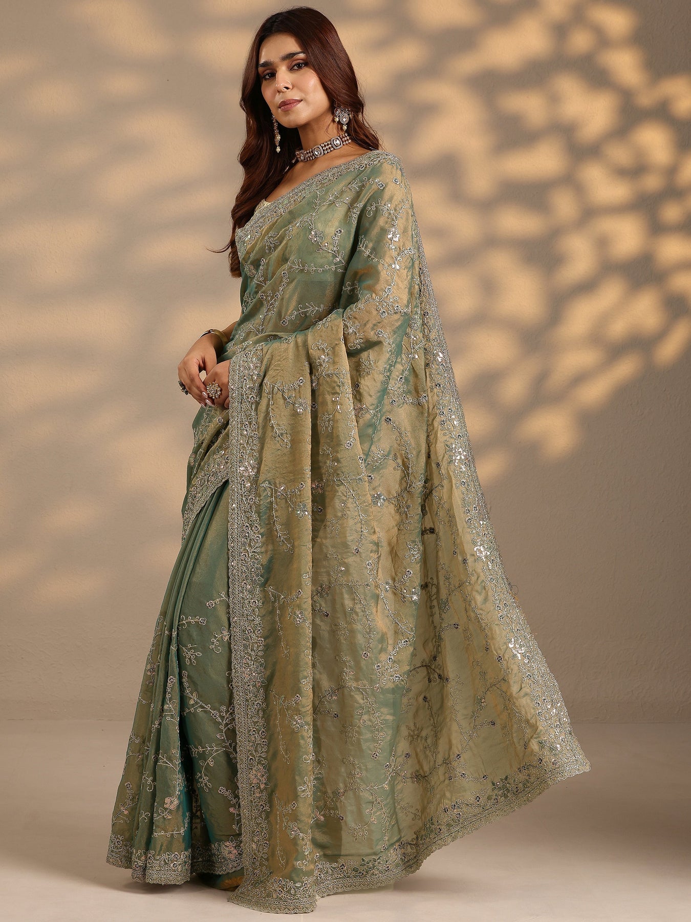 Green Embroidered Organza Saree With Unstitched Blouse Piece