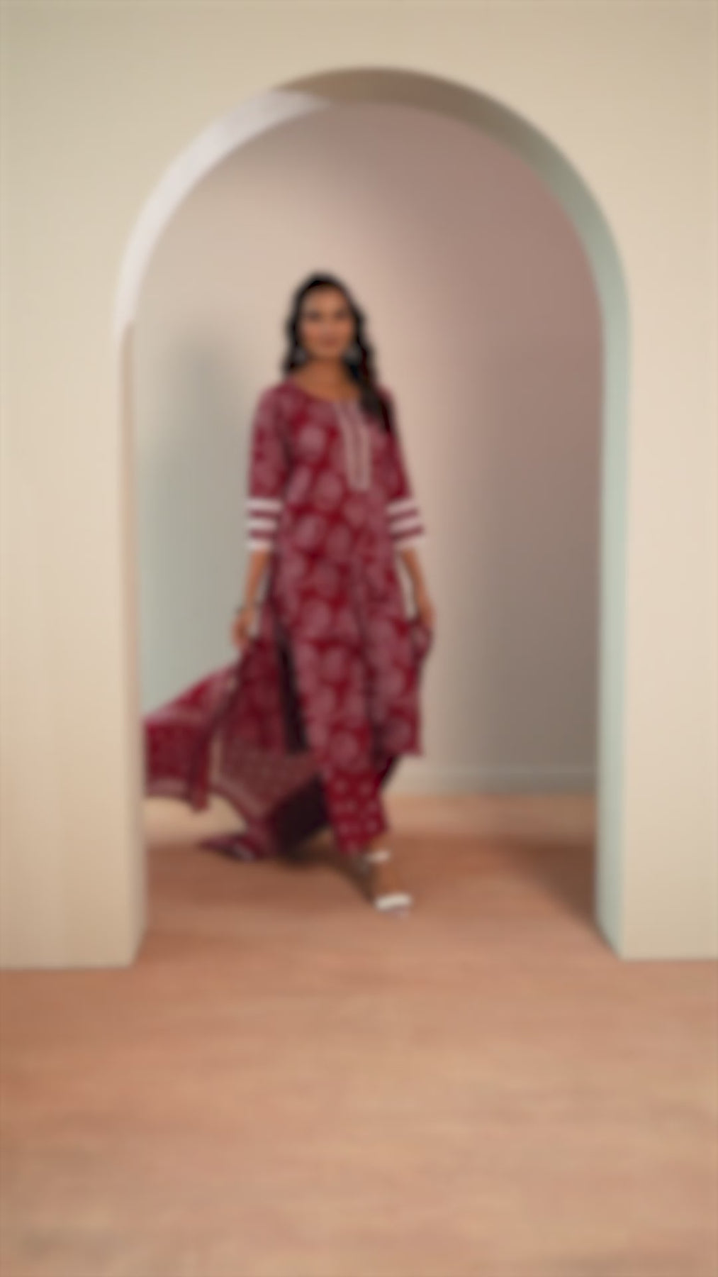 Maroon Printed Cotton Straight Suit Set With Dupatta