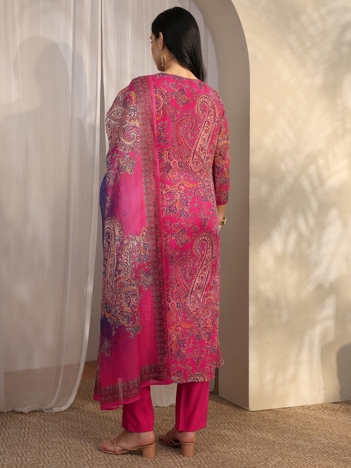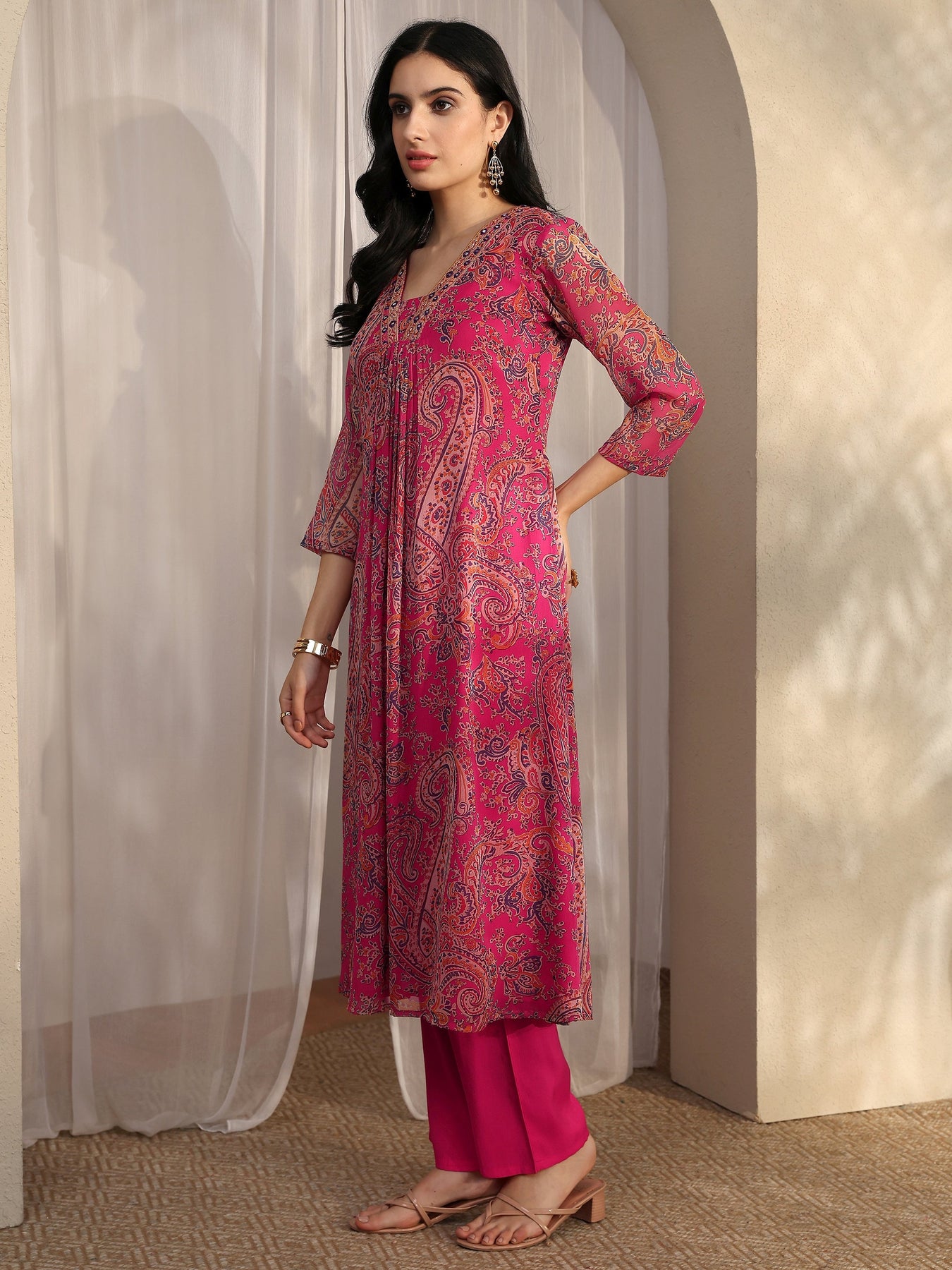 Pink Paisley Printed Chiffon A-Line Suit Set With Dupatta