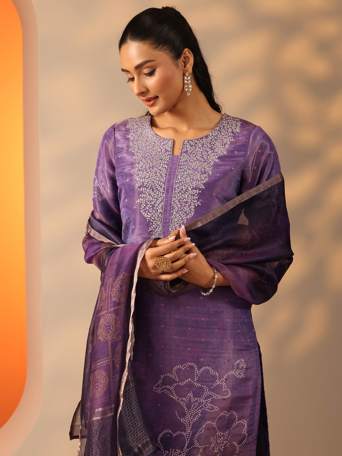 Purple Embellished Silk Blend Straight Suit Set With Dupatta