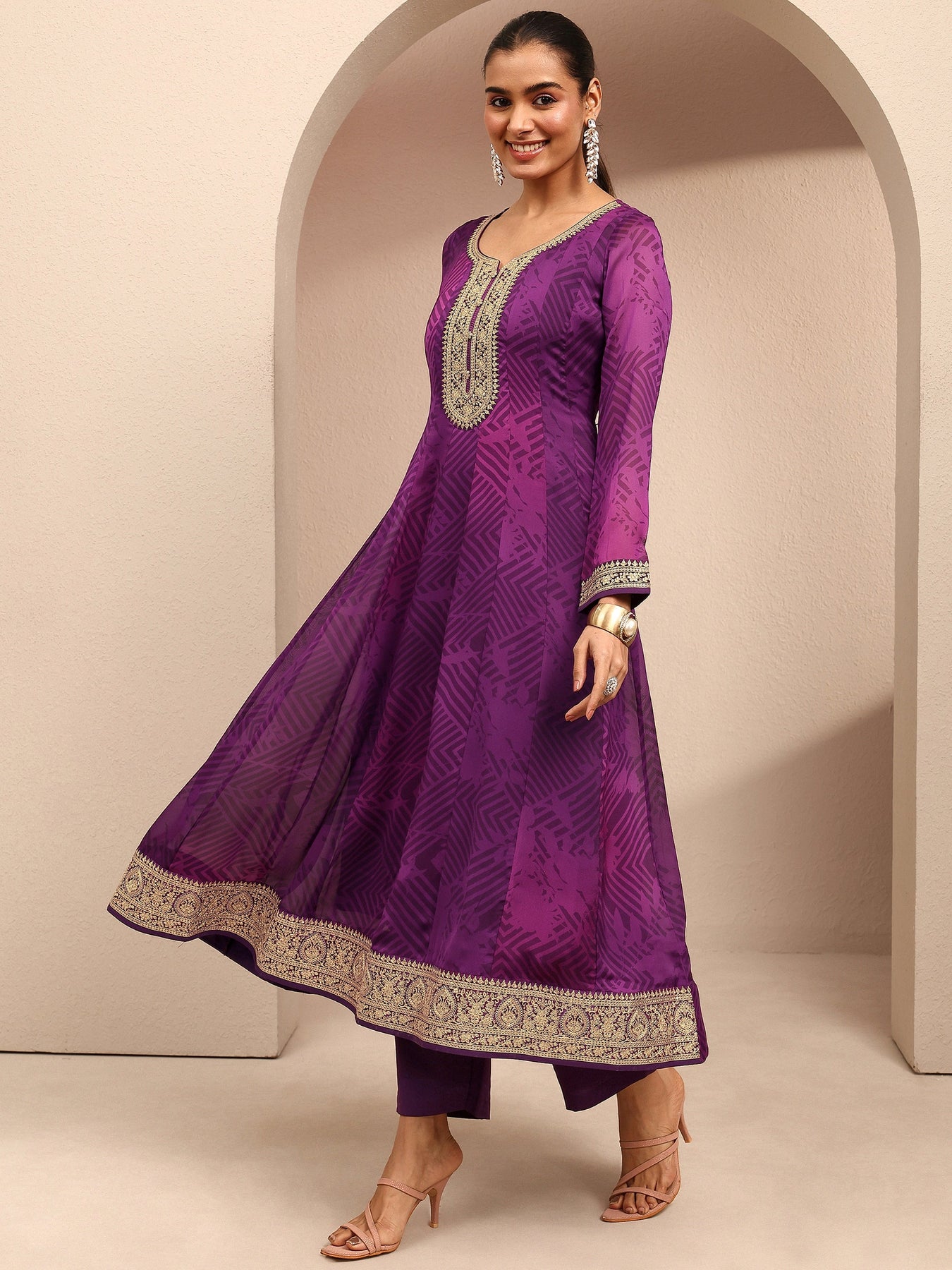 Our 3-piece purple chiffon Anarkali kurta set features a sweetheart neckline, regular sleeves, and statement yoke. Complemented with lining and straight pants with a partially elasticated waistband and 2 pockets, and a printed dupatta. Adorned with ethnic motif printed, this style is perfect for dark festive occasions.