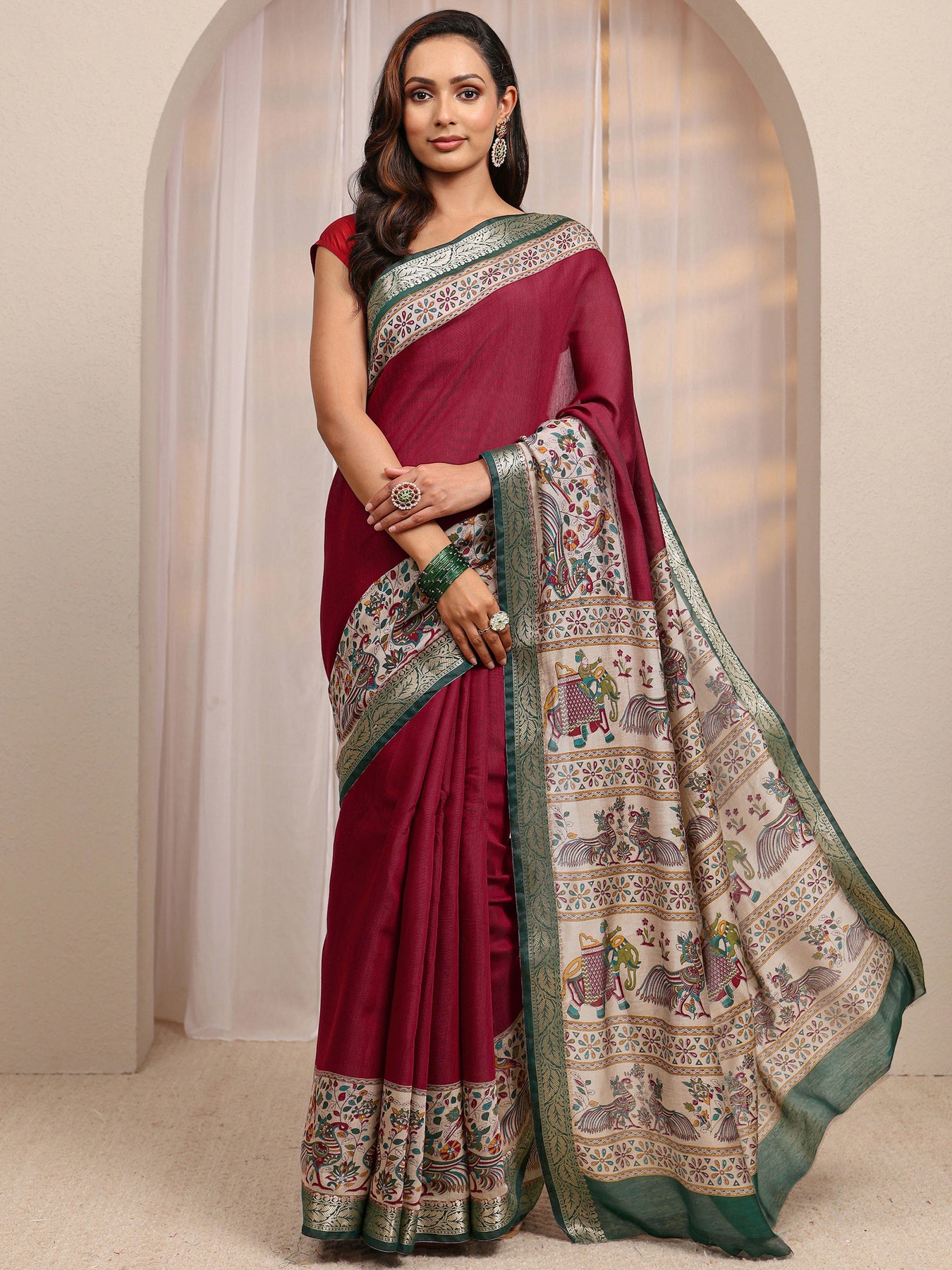Red Ethnic Motif Printed Silk Blend Saree With Unstitched Blouse Piece
