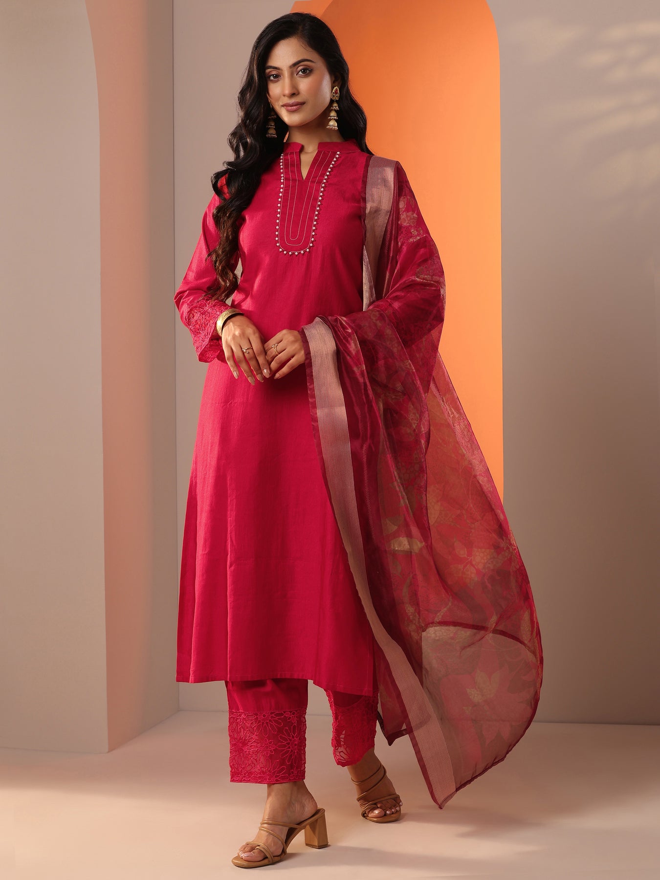 Red Woven Design Silk Blend Straight Suit Set With Dupatta
