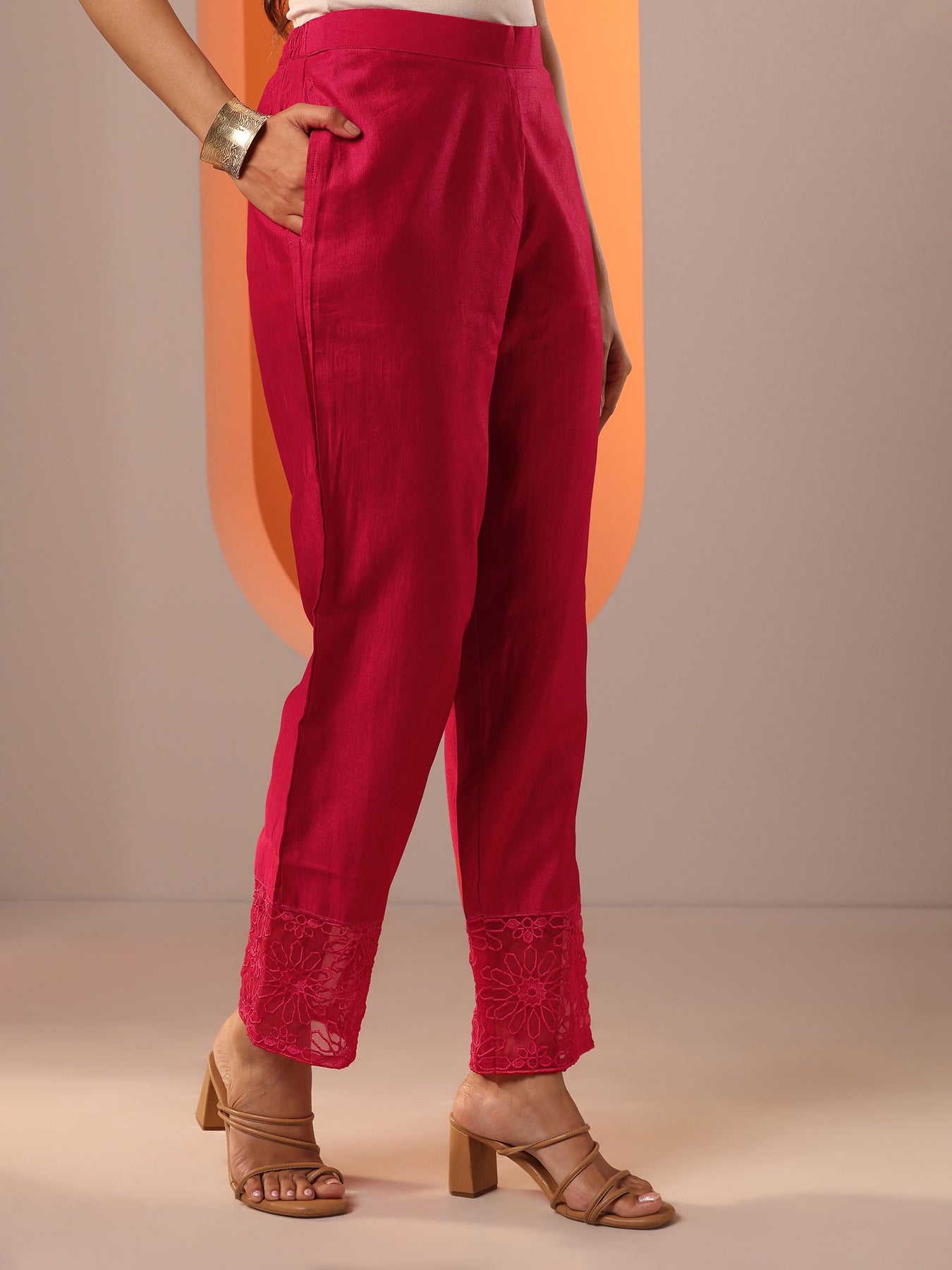 Our 3-piece Red Silk blend Straight-fit Kurta Set features a V-Neckline, Regular Sleeves, and statement yoke. Complemented with Straight Pants with a Partially Elasticated waistband and 2 pockets, and a Printed dupatta. Adorned with Woven Design, this style is perfect for Festive occasions.