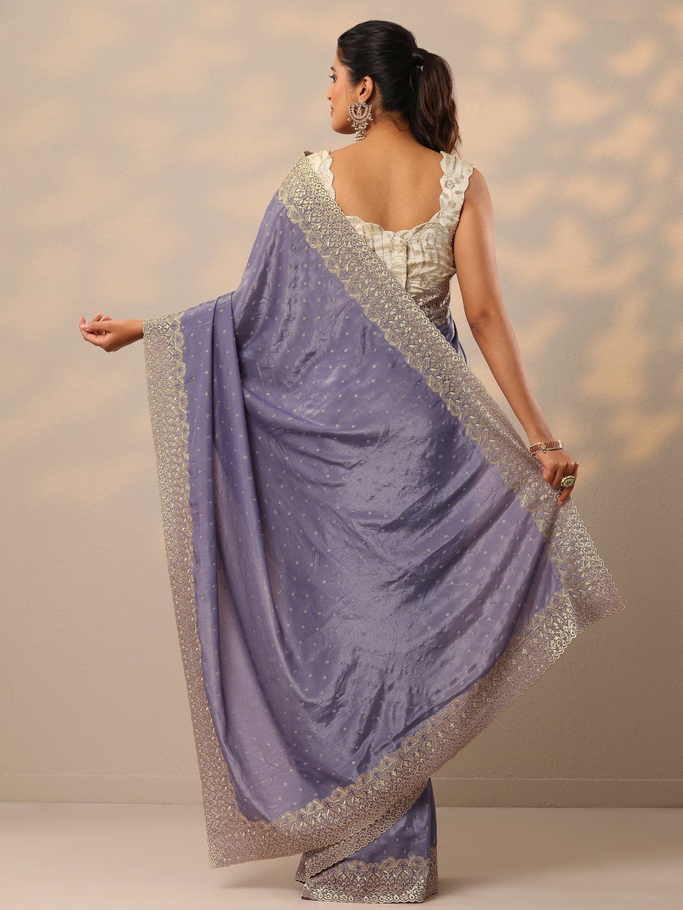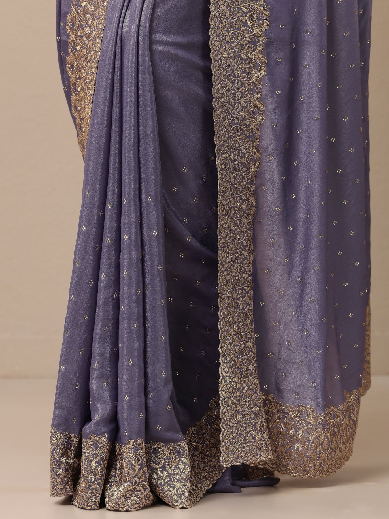 Our Lavender Embellished Crepe Saree. Complemented With An Unstitched Blouse Piece. This Charming Saree Is Perfect For Festive Occasions.
