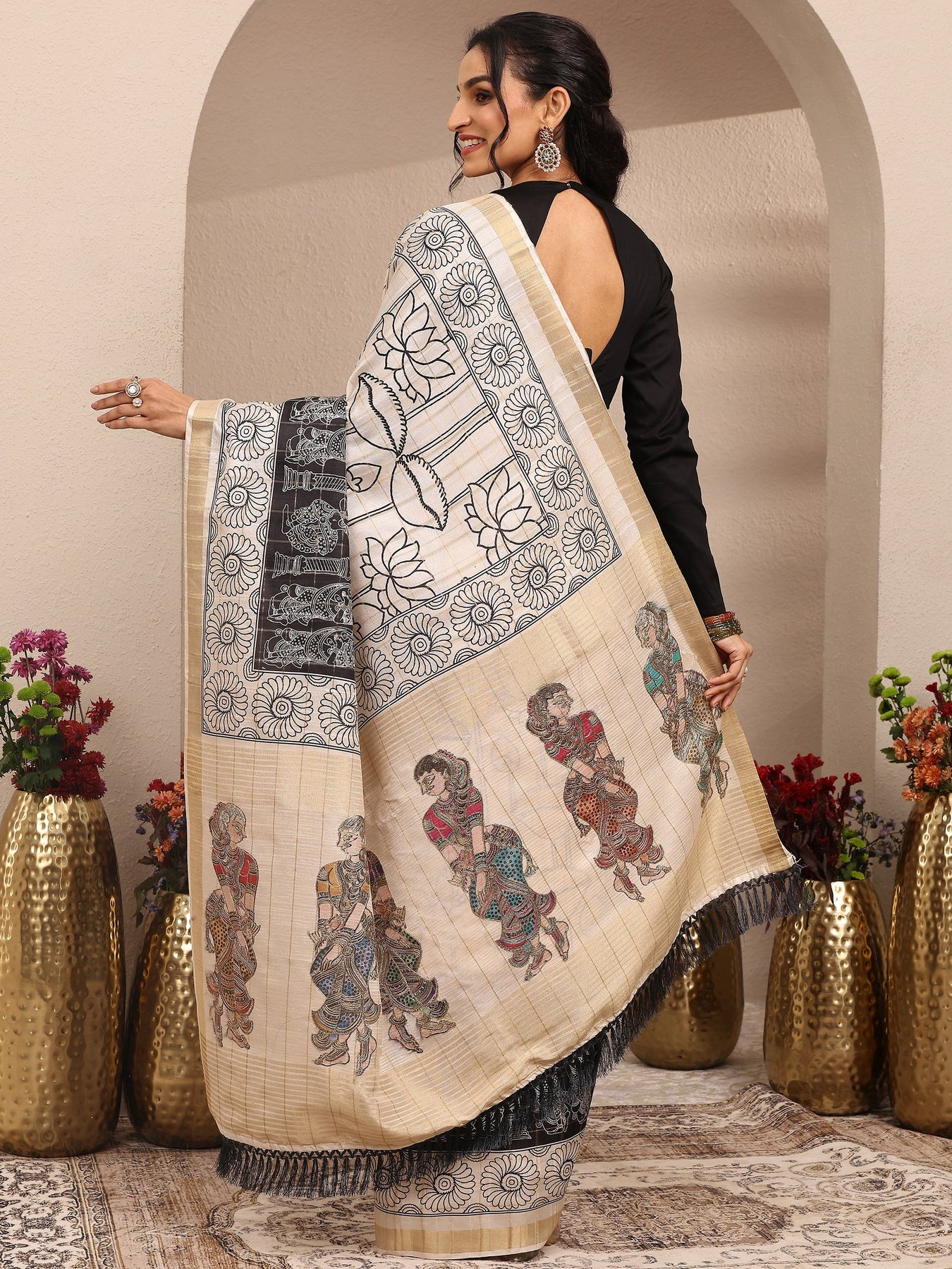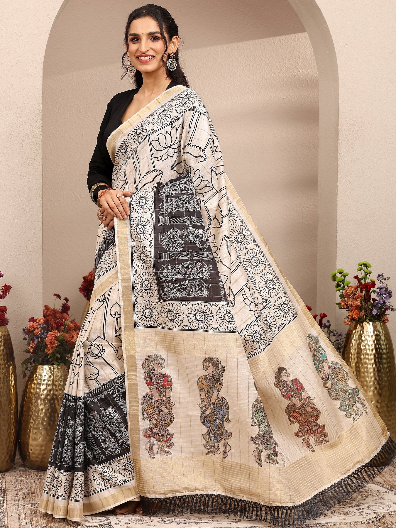Cream Tribal Printed Silk Blend Saree With Unstitched Blouse Piece