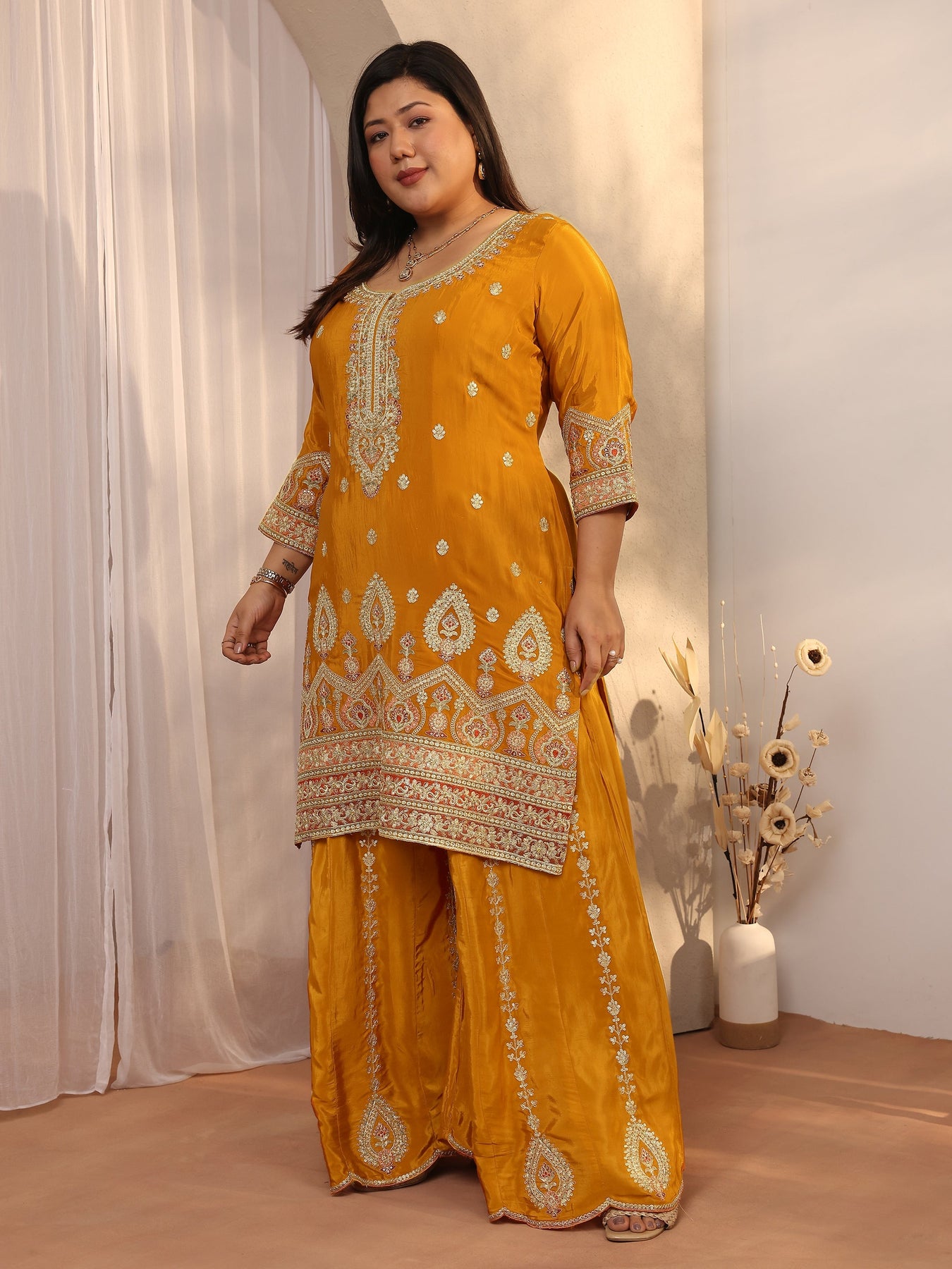 Our 3-piece orange crepe straight-fit kurta set features a round neckline, regular sleeves, and statement yoke. Complemented with lining and sharara pants with a partially elasticated waistband, and a printed dupatta. Adorned with ethnic motif embroidered, this style is perfect for festive occasions.