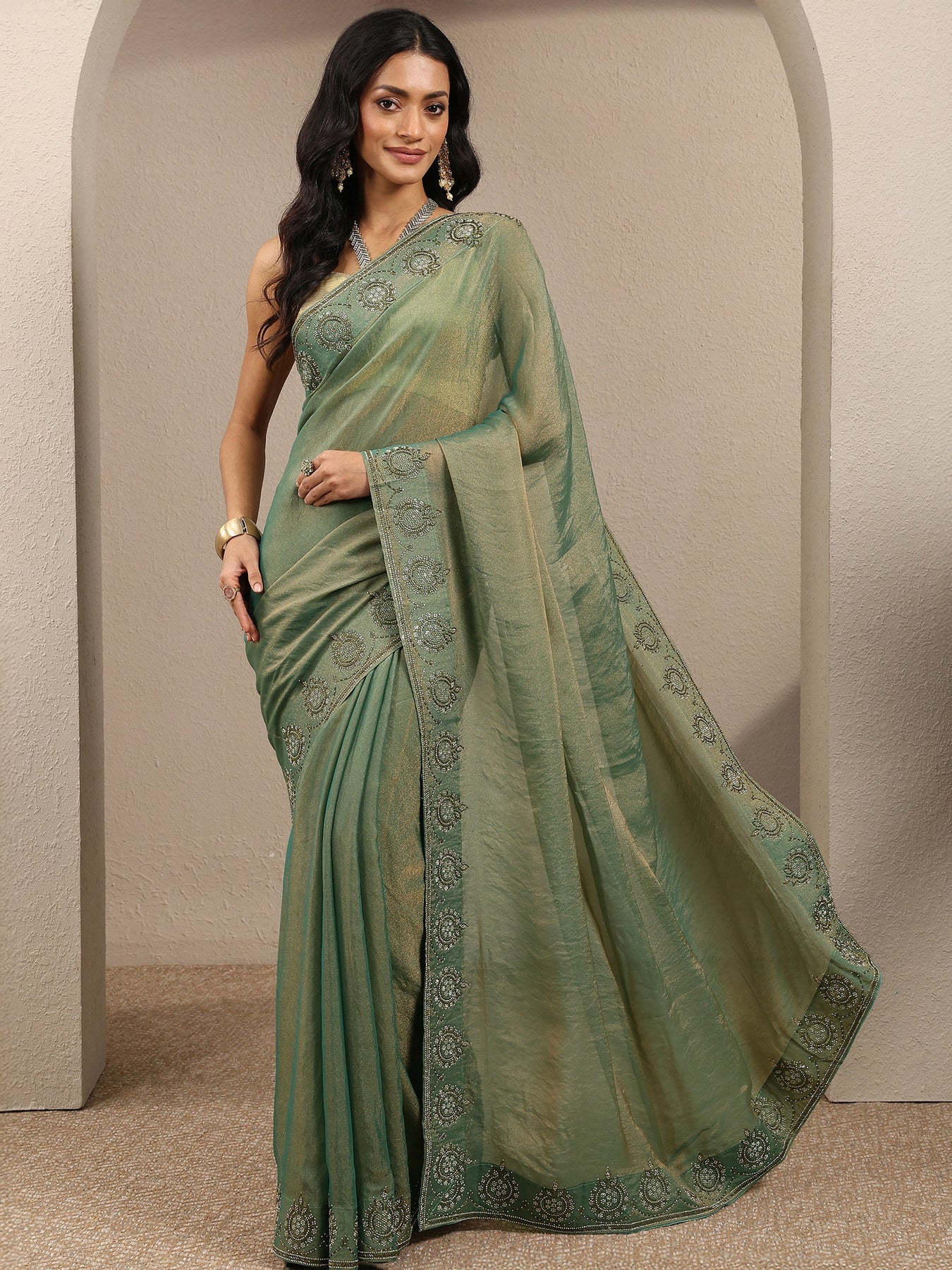 Our sea green printed silk blend saree features captivating embellishments. Complemented with a Unstitched blouse piece.. This charming saree is perfect for special occasions.