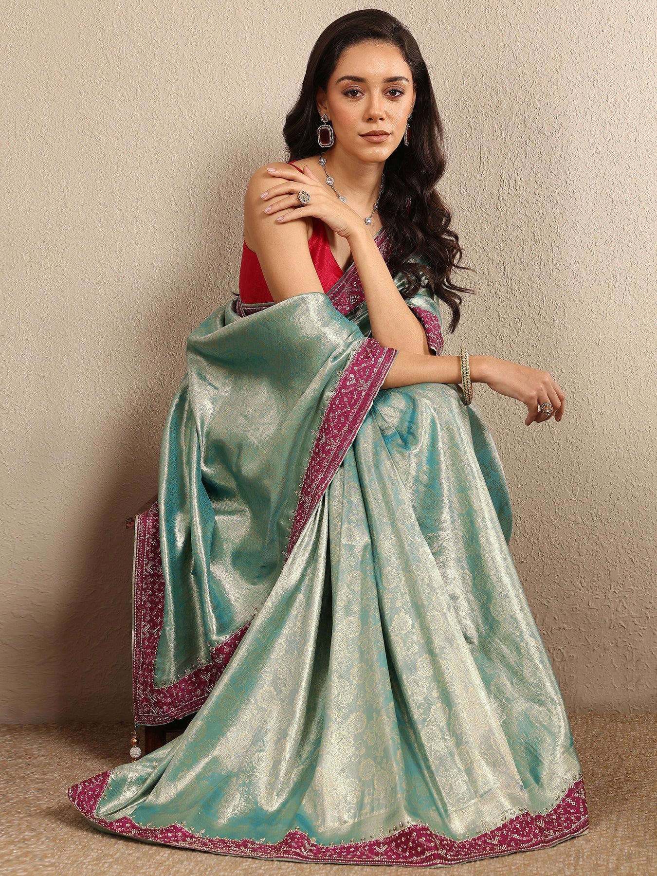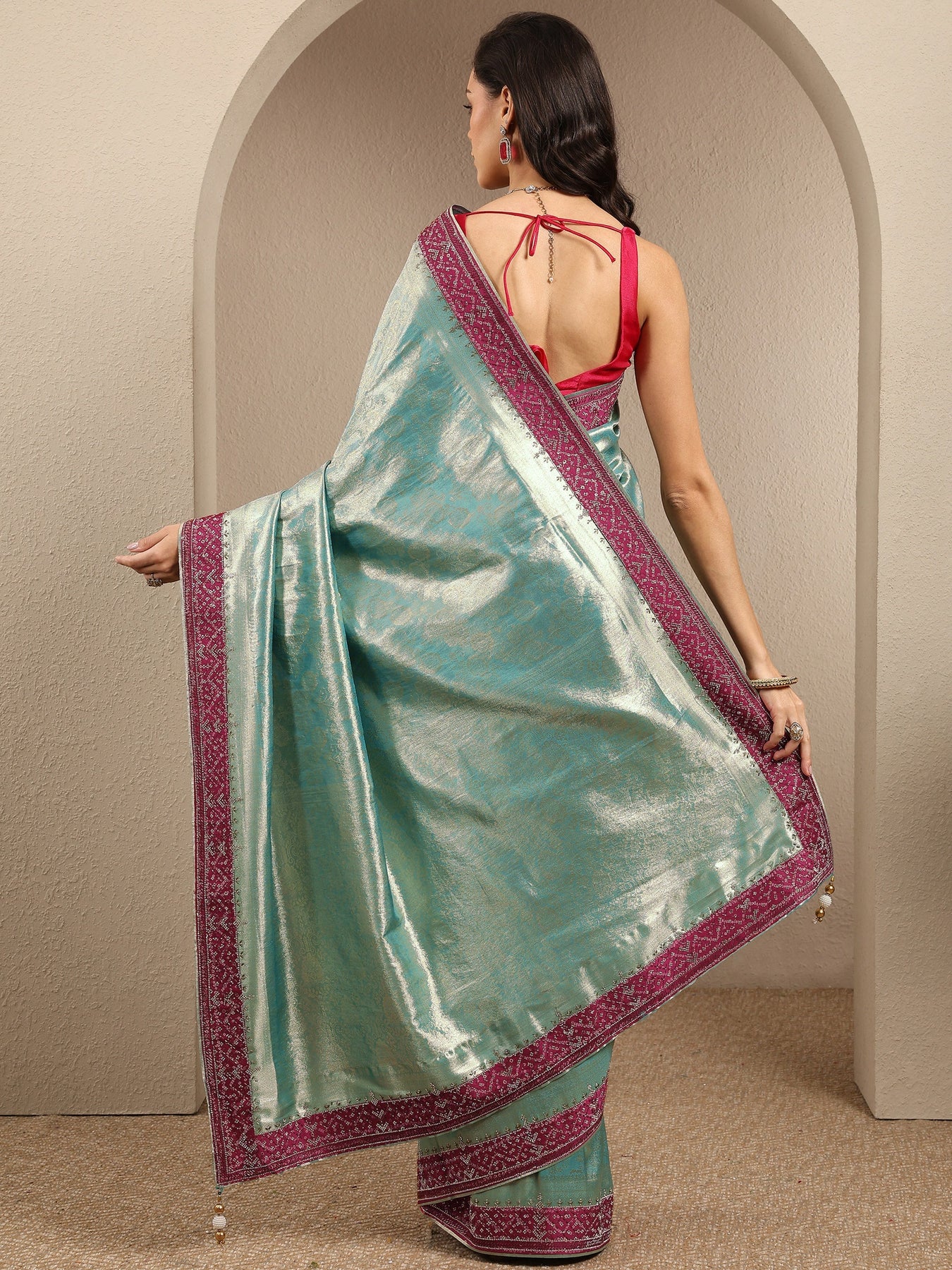 Our sea green printed silk blend saree features captivating embellishments. Complemented with a Unstitched blouse piece.. This charming saree is perfect for special occasions.