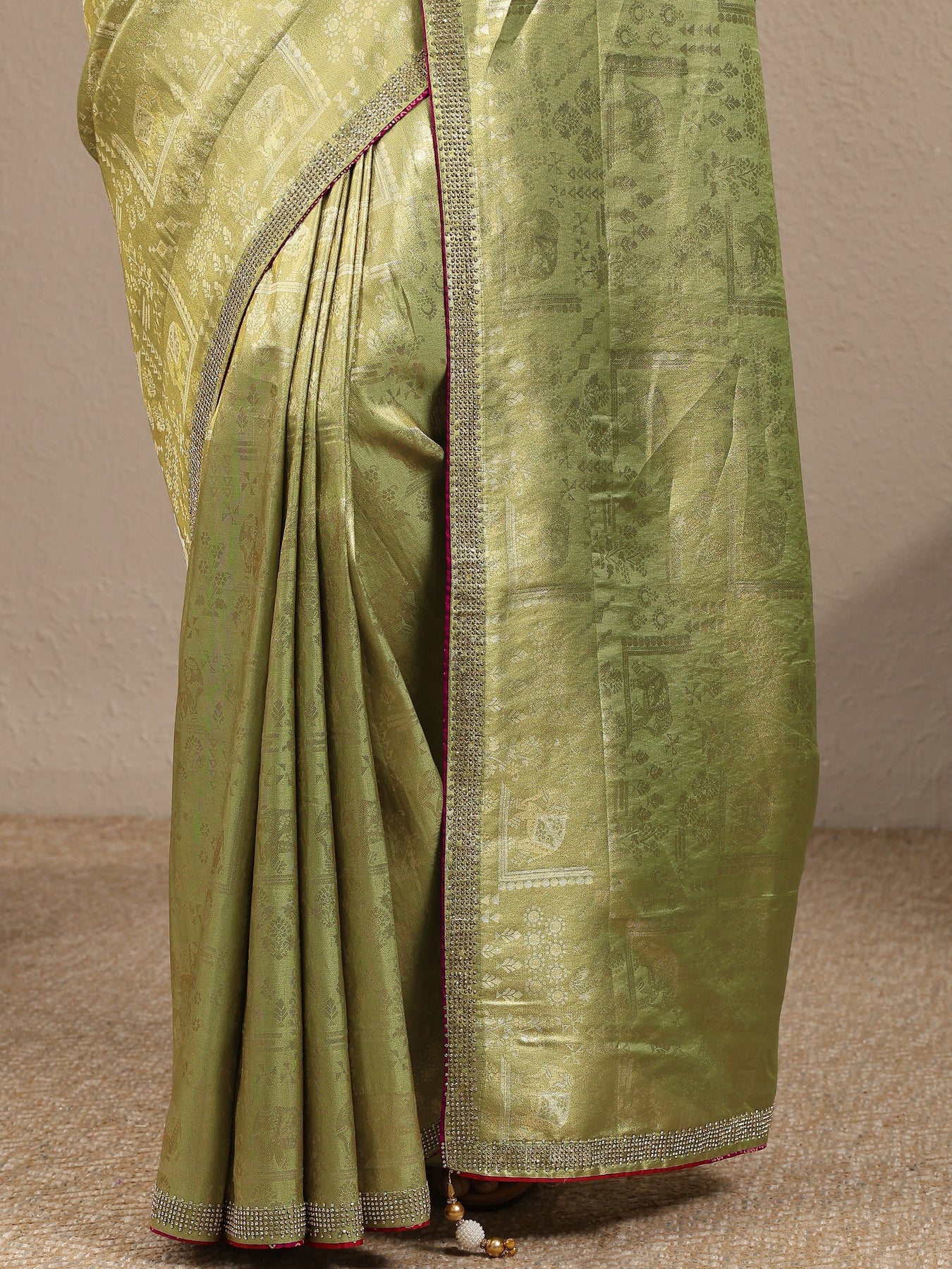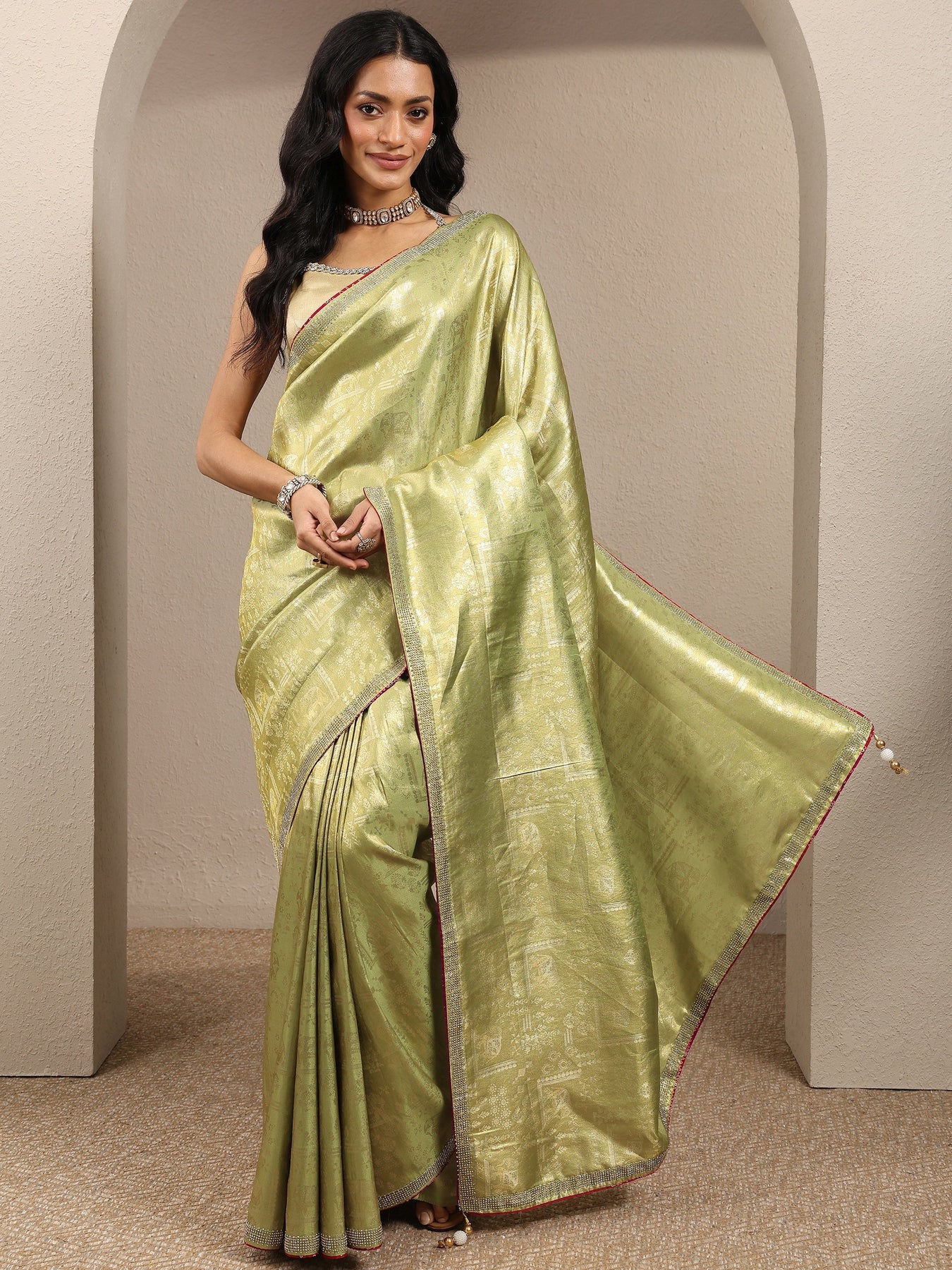 Our olive printed silk blend saree features captivating top pattern. Complemented with a Unstitched blouse piece.. This charming saree is perfect for special occasions.