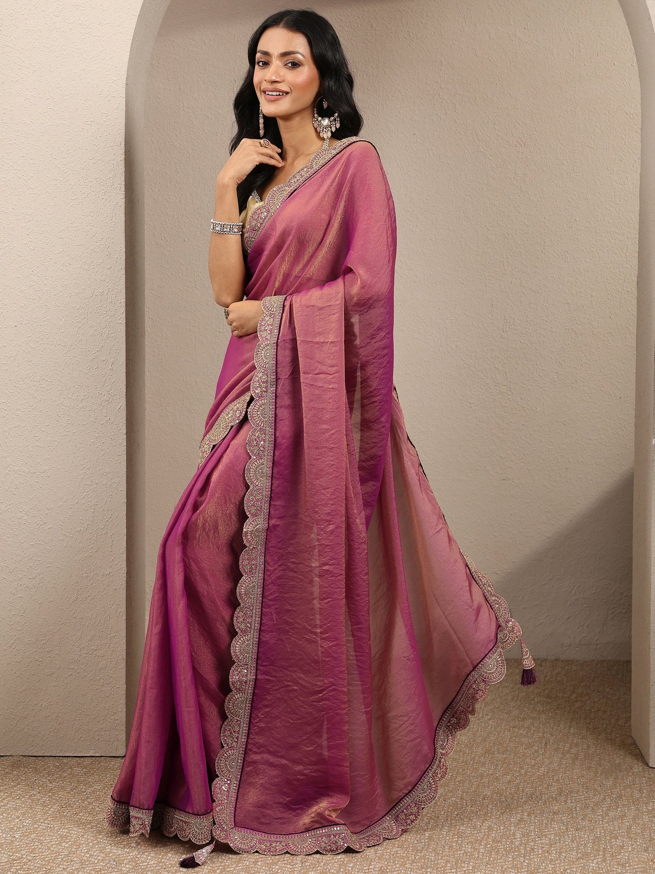 Our Magenta printed Organza saree features captivating lace embellishments. Complemented with a Unstitched blouse piece.. This charming saree is perfect for festive occasions.