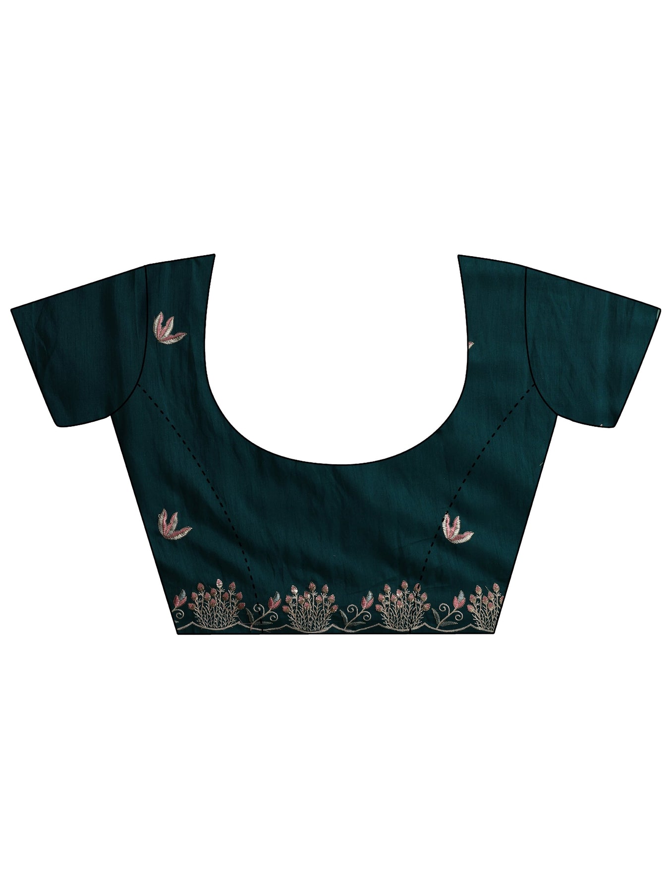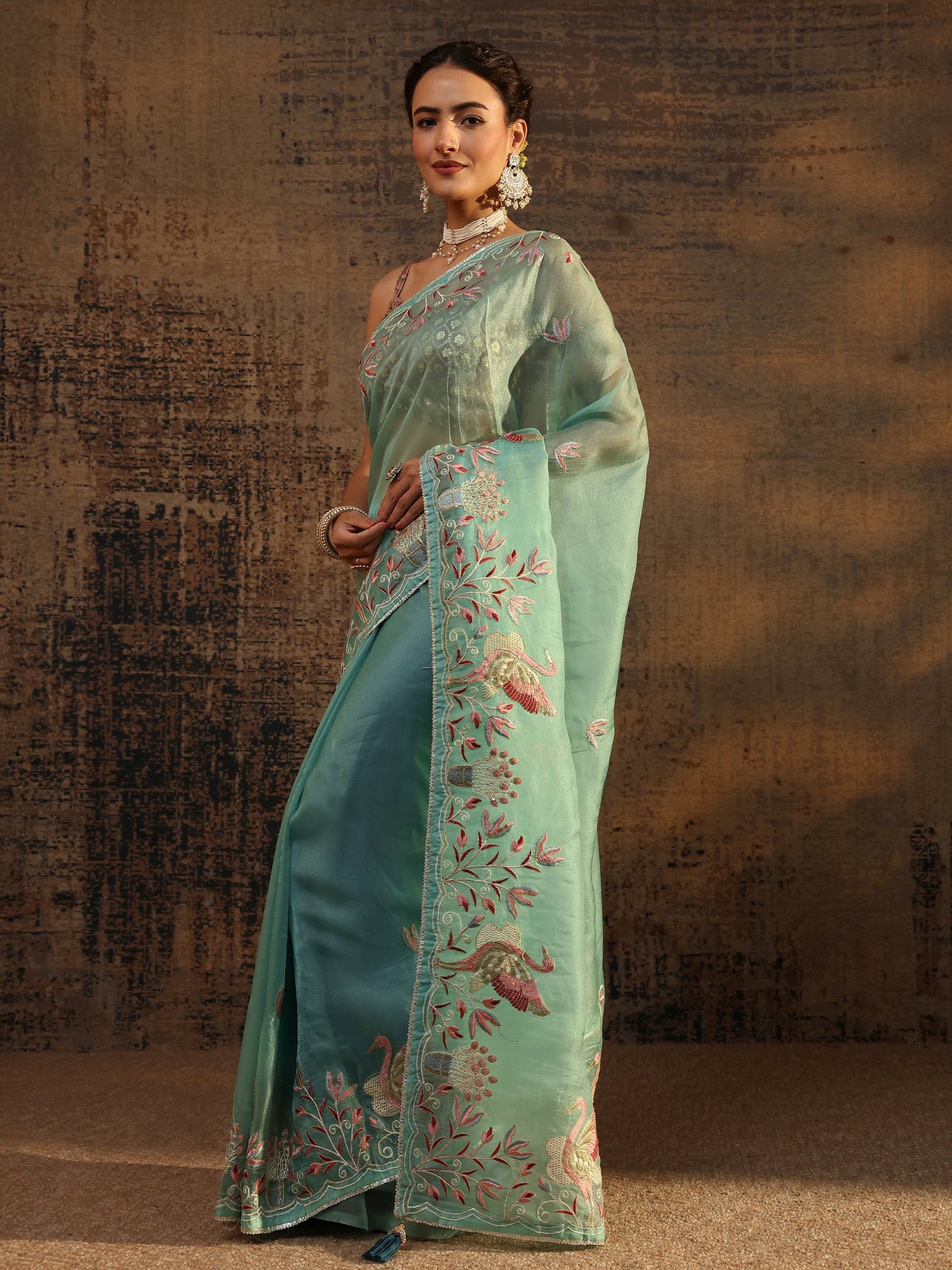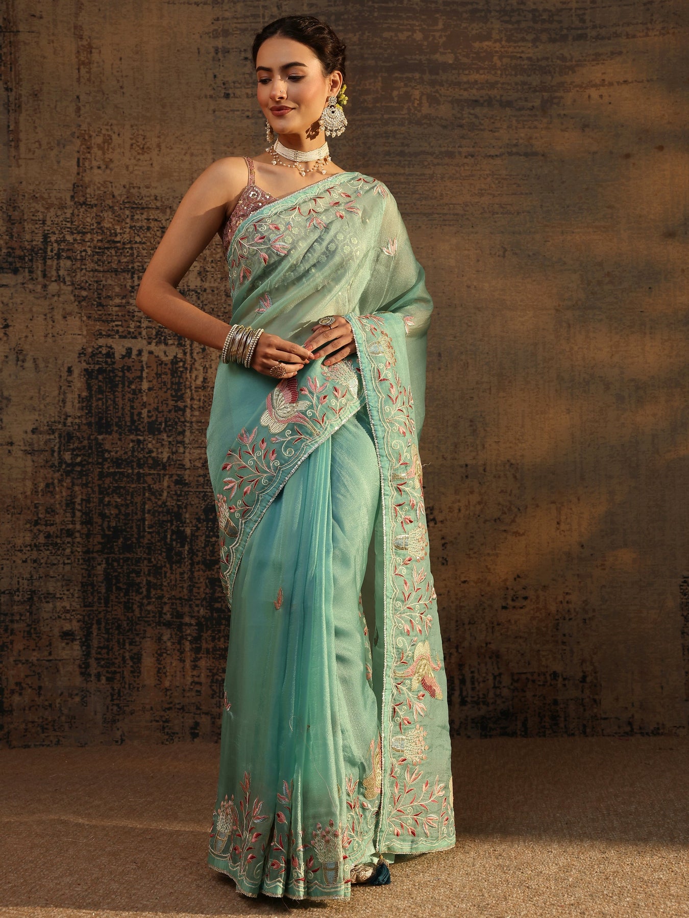 Blue Floral Embroidered Tissue Saree With Unstitched Blouse Piece