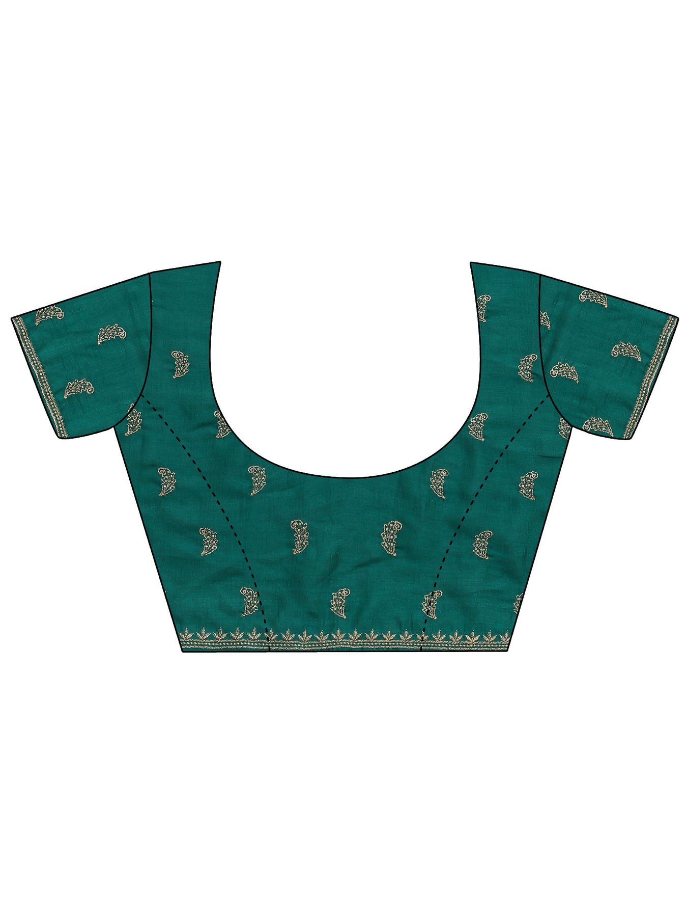 Our teal silk blend saree features captivating embellishments. Complemented with an unstitched blouse piece. This charming saree is perfect for festive occasions.
