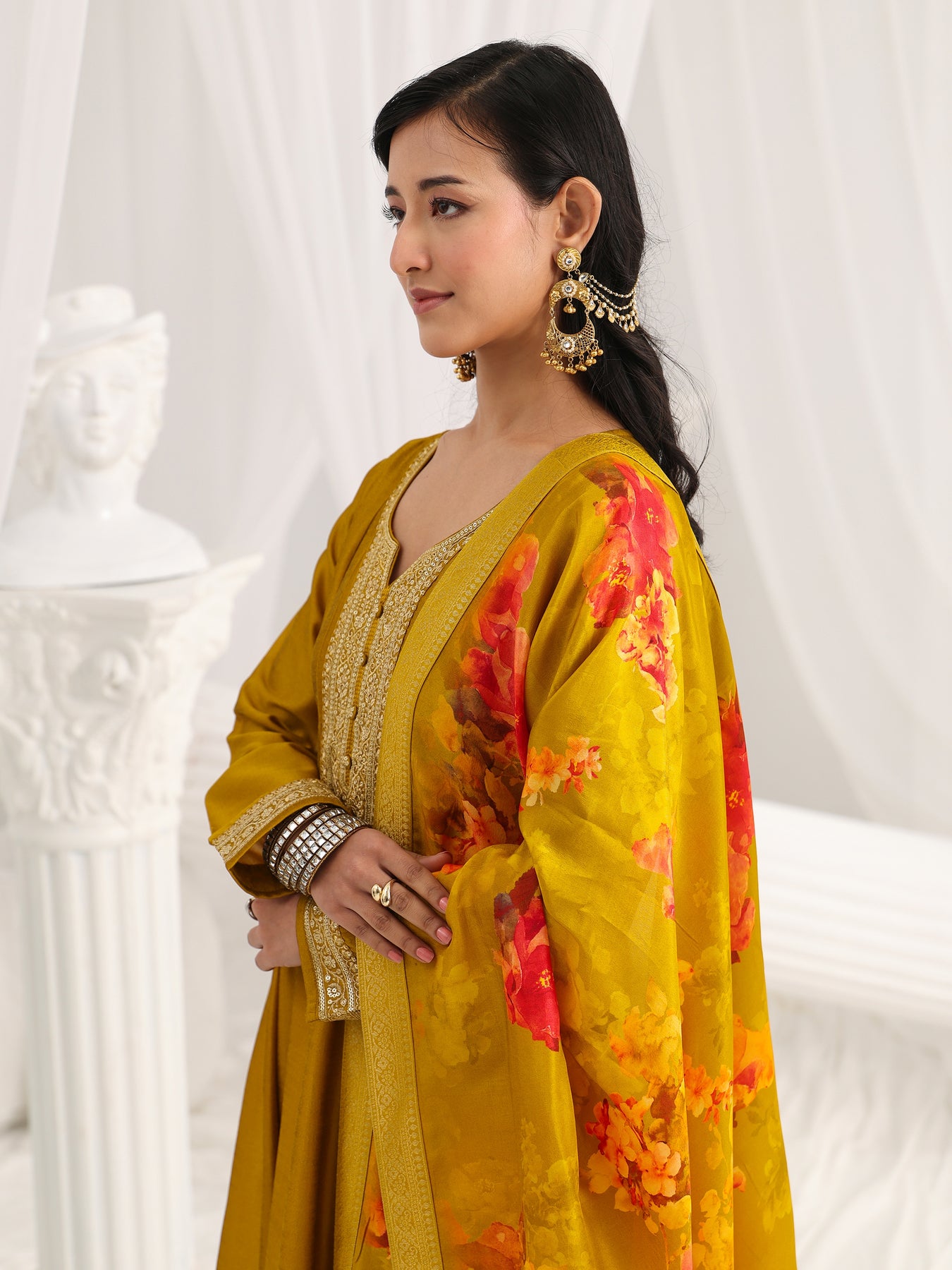 Our 3-piece mustard silk blend Anarkali kurta set features a sweetheart neckline, regular sleeves, and statement yoke. Complemented with straight pants with a partially elasticated waistband and 2 pockets, and a printed dupatta. Adorned with floral zari embroidered, this style is perfect for festive occasions.