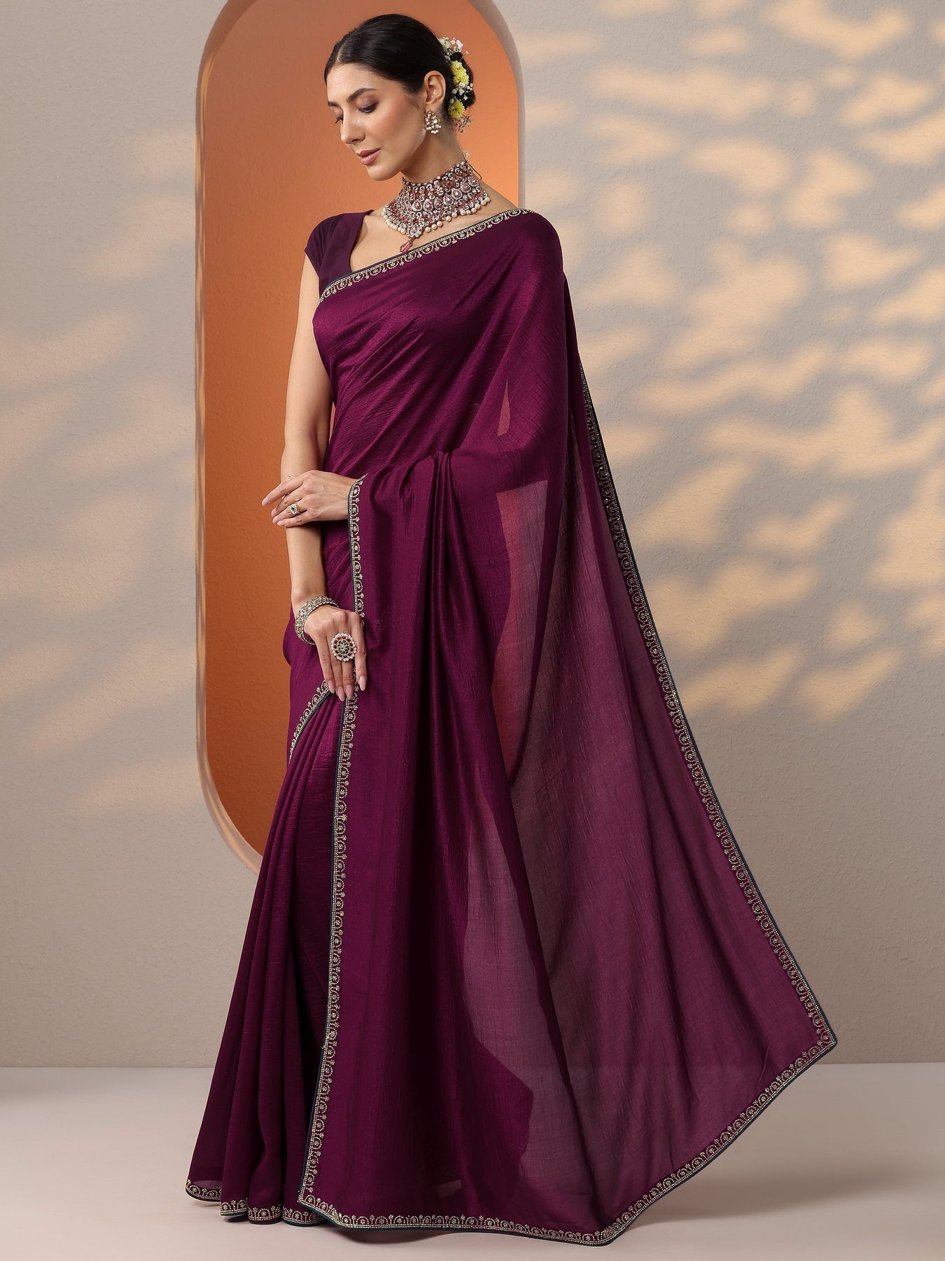 Our Burgundy silk blend saree features captivating embellishments. Complemented with a stitched blouse. This charming saree is perfect for festive occasions.