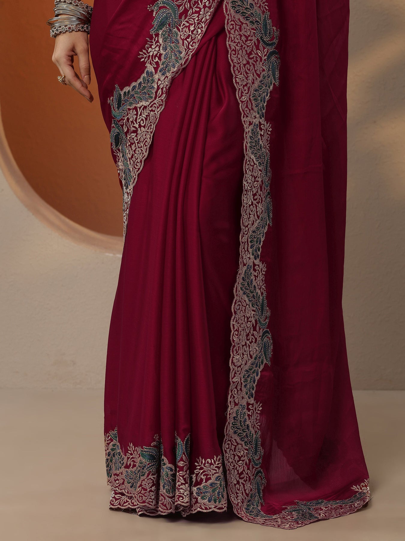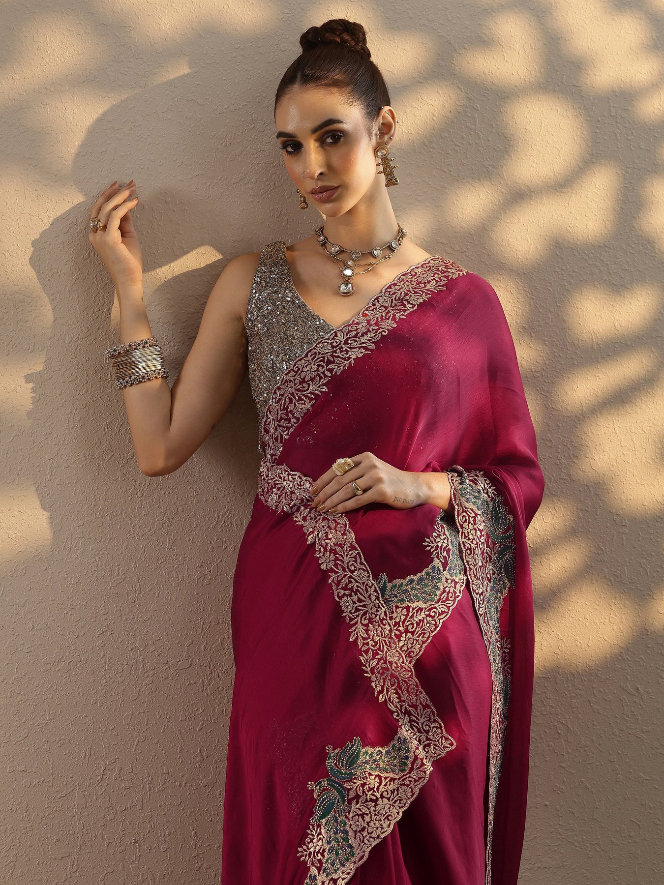 Our Red Embellished Chiffon Saree. Complemented With An Unstitched Blouse Piece. This Charming Saree Is Perfect For Festive Occasions.