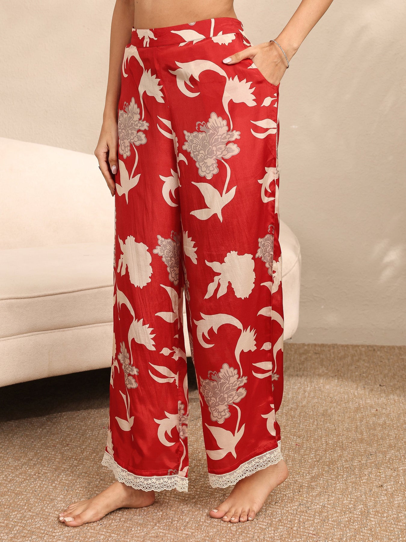 Our 2-piece red printed Silk blend nightsuit features a Straight-fit Shirt with a V-Neck neckline and Three-quarter sleeves. Complemented with matching Pyjamas with Partially Elasticated waistband and 2 pockets. Elevated with floral Print, this style is perfect for Night Wear.