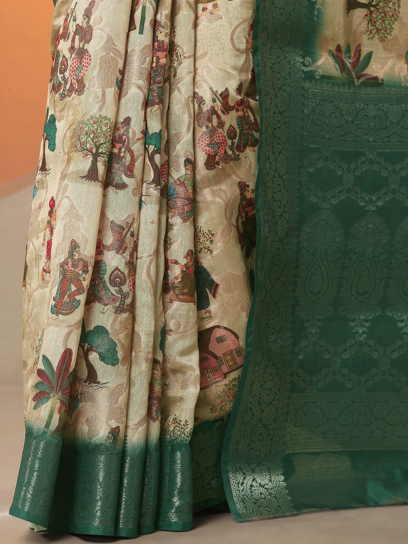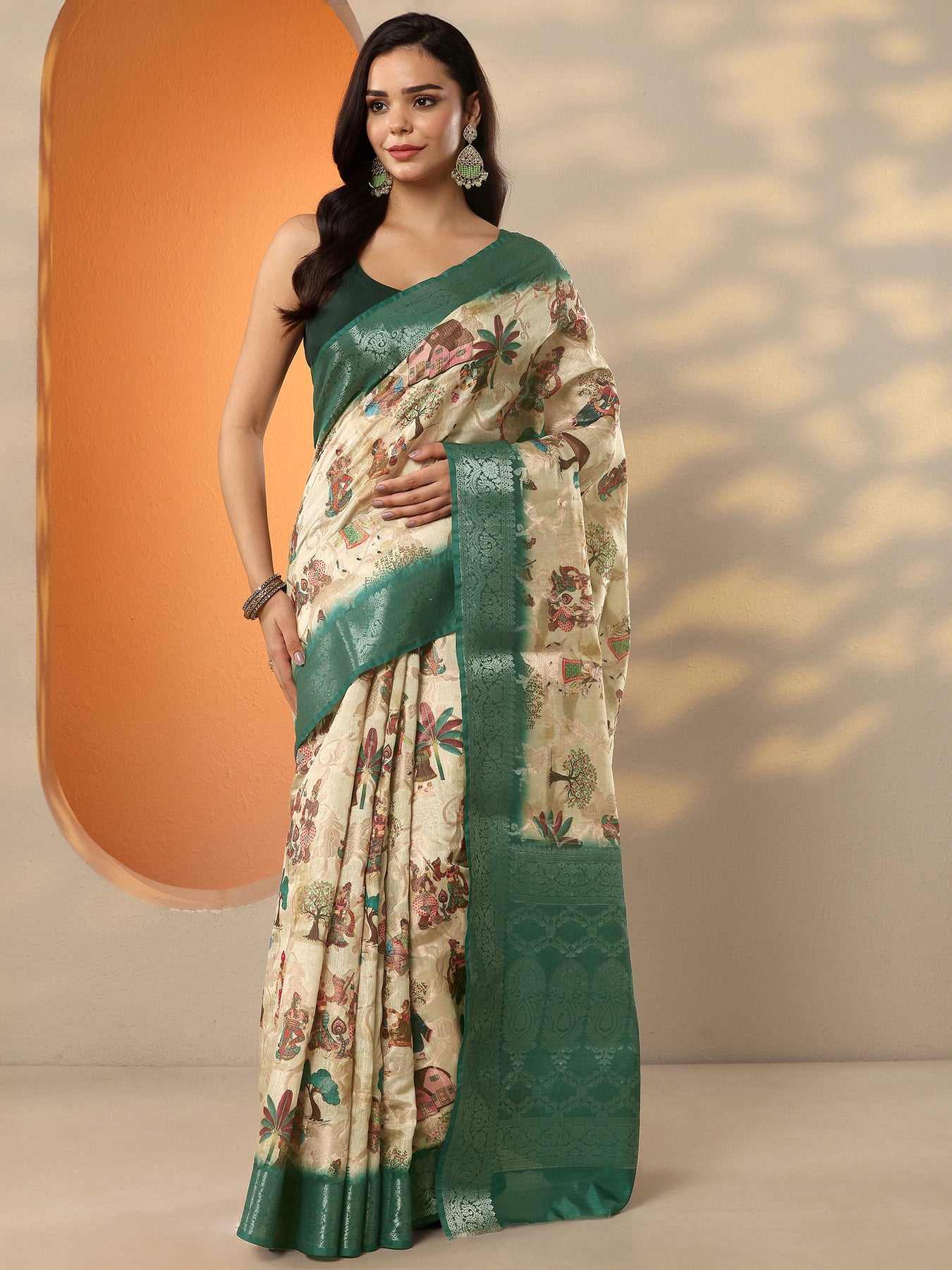 Beige Tribal Printed Silk Blend Saree With Unstitched Blouse Piece