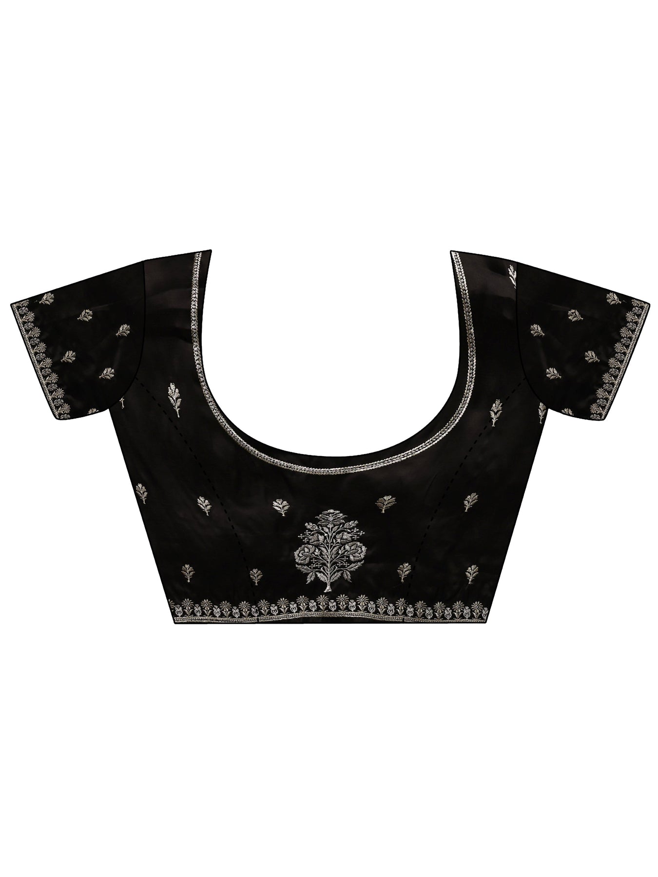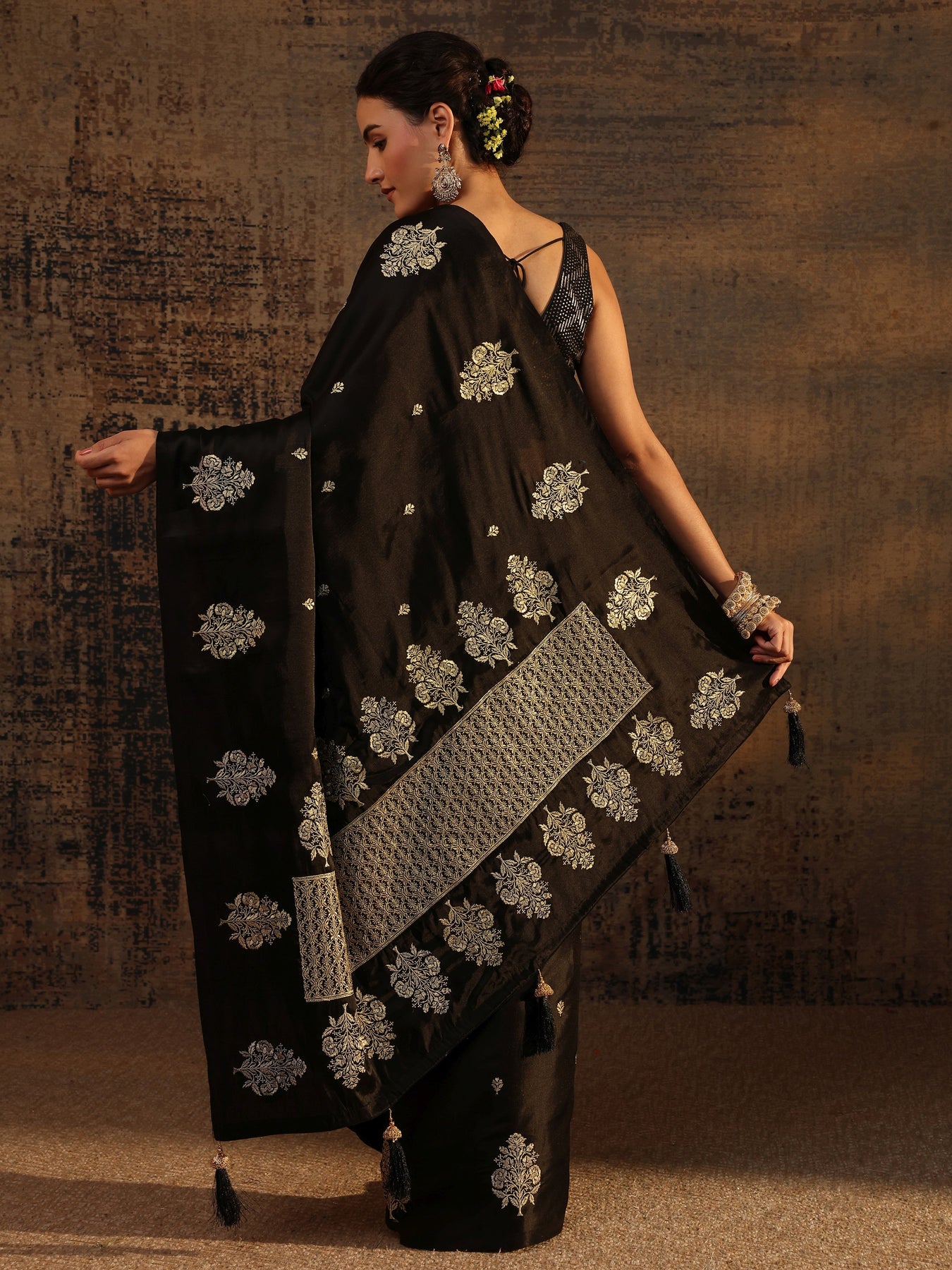 Black Floral Embroidered Silk Blend Saree With Unstitched Blouse Piece