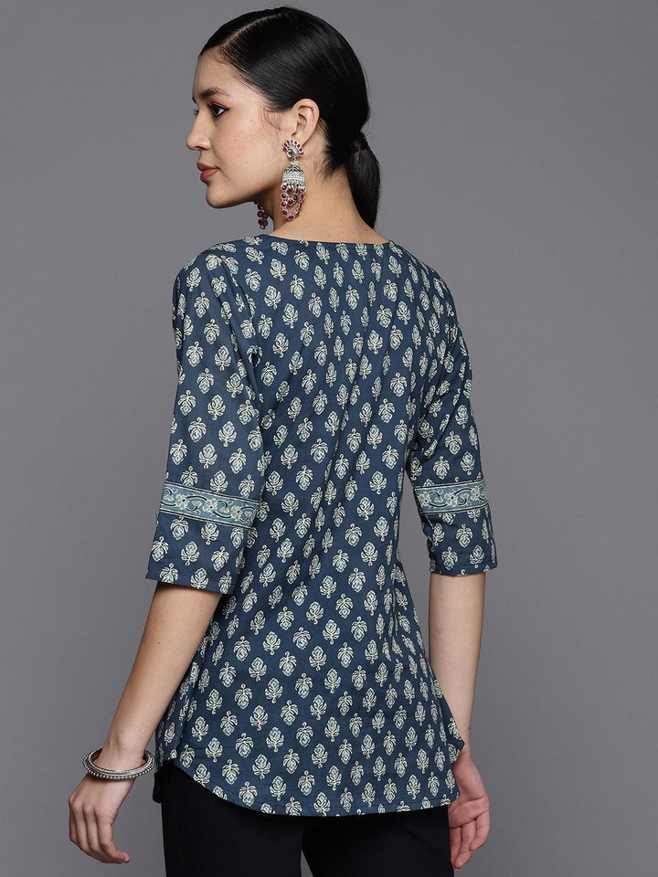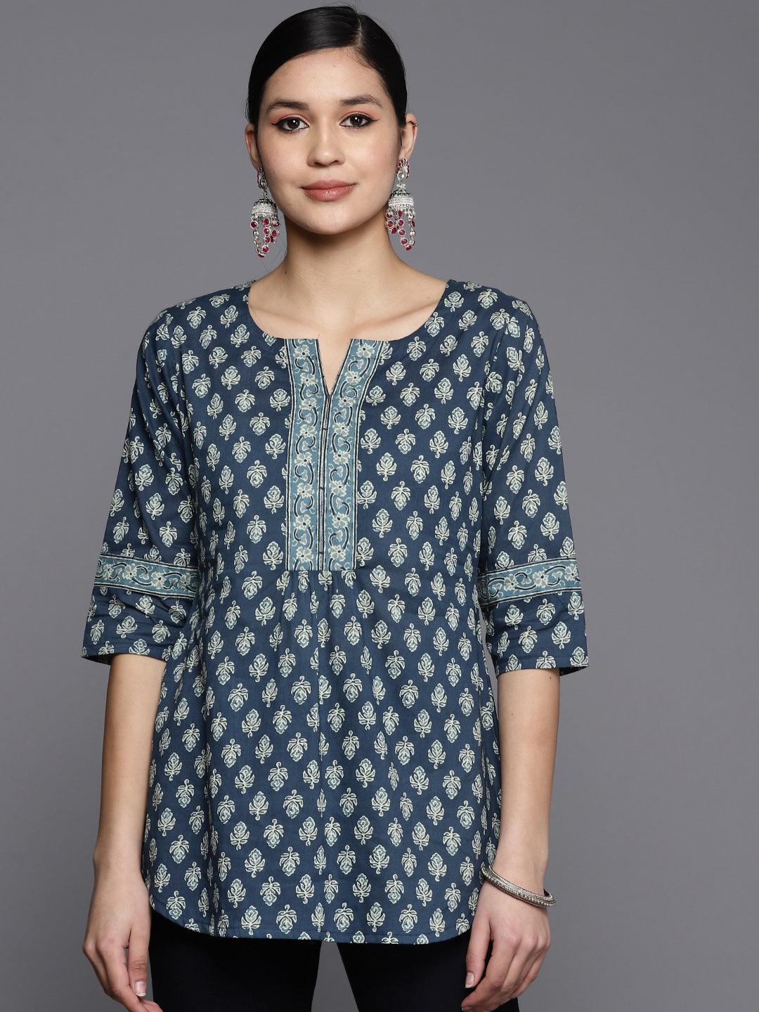 Our blue floral print pathani short cotton kurti features a notched neckline and three-quarter sleeves. Adorned with delicate fabric-trim accents, this versatile style is ideal for work and beyond.