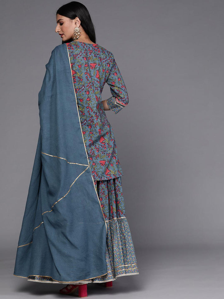 Our 3-piece blue printed cotton suit set features a floral print straight-fit short kurti, a statement yoke, three-quarter sleeves, a flared skirt with a partially elasticated waistband, and a dupatta in a complementing solid tone. Adorned with delicate Gota Patti and lace-trim accents, this elegant style is ideal for daytime festivities.