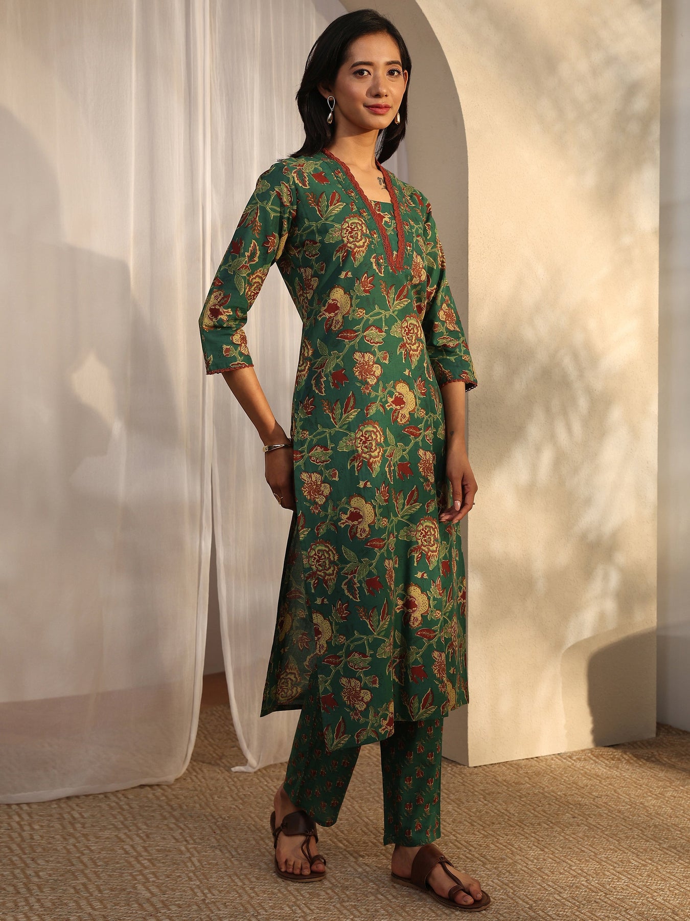 Our 3-piece green cotton straight-fit kurta set features a V-neckline, regular sleeves, and statement yoke. Complemented with straight pants with a partially elasticated waistband and 2 pockets, and a printed dupatta. Adorned with floral printed, this style is perfect for dark festive occasions.
