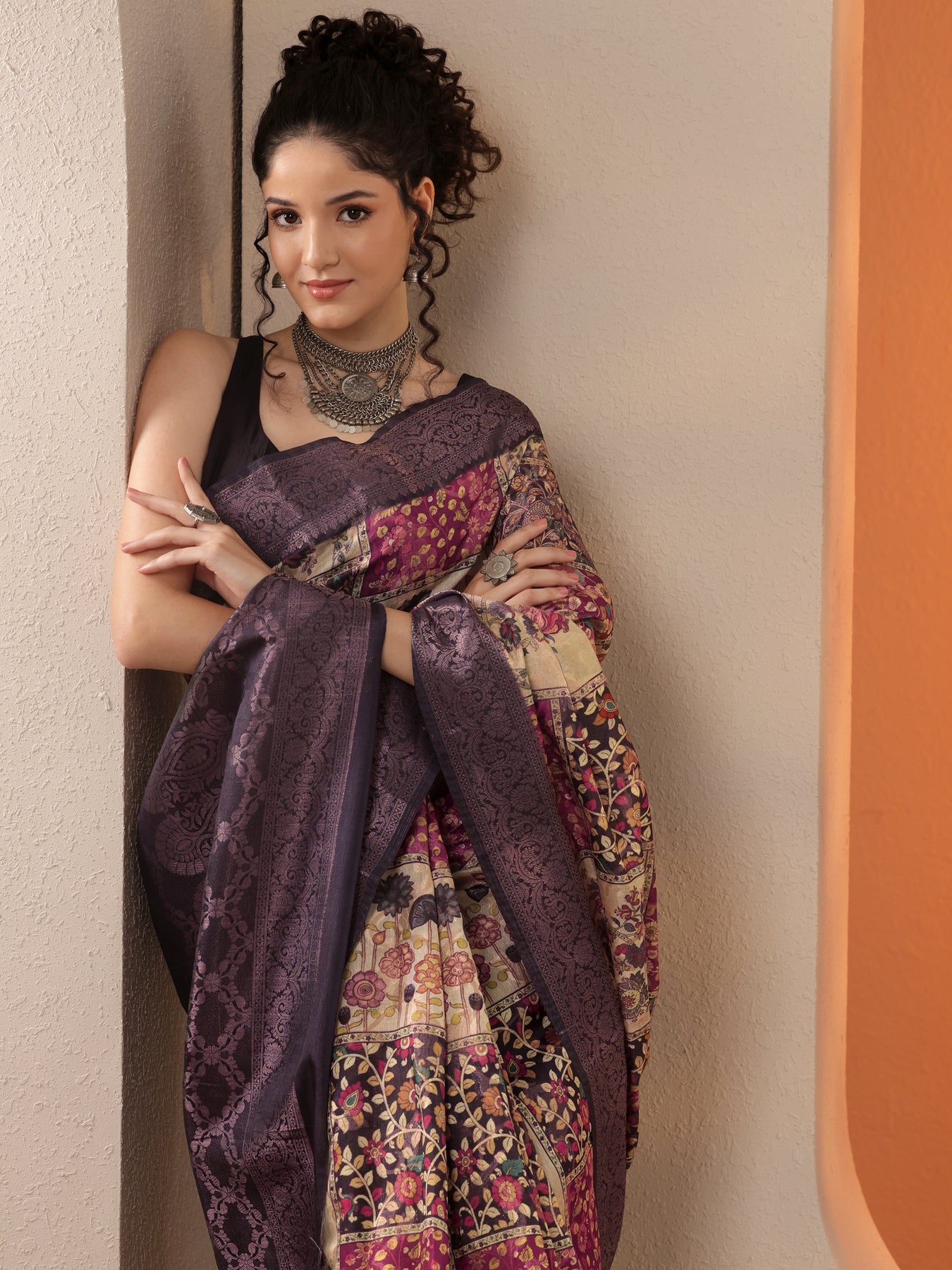 Multi Printed Silk Blend Saree With Unstitched Blouse Piece
