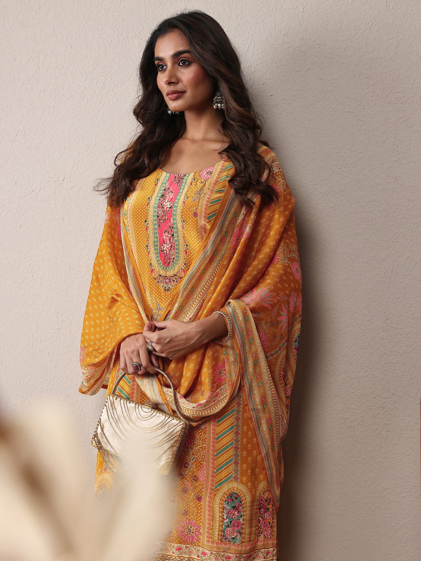 Mustard Printed Silk Blend Straight Suit Set With Dupatta