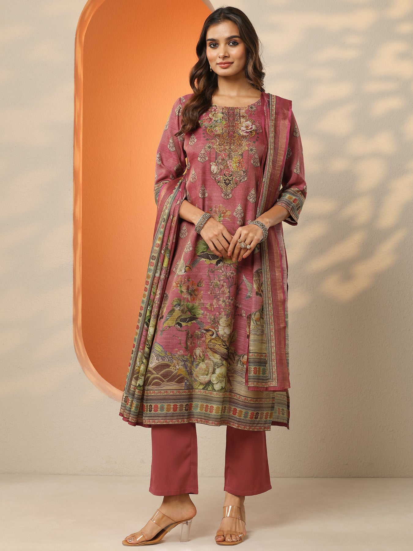 Pink Printed Silk Blend Straight Suit Set With Dupatta