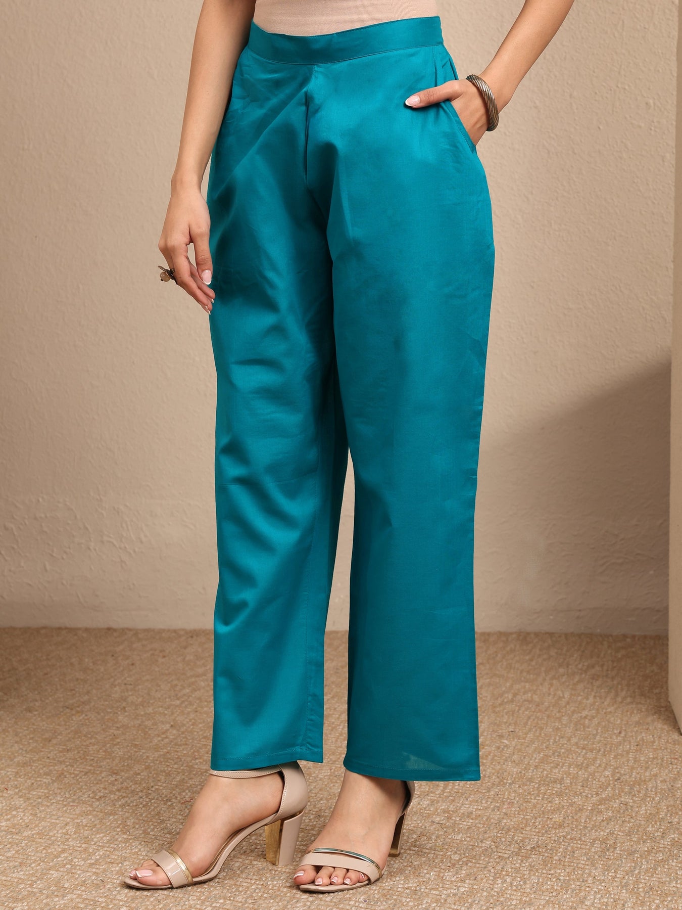 Our 3-piece teal silk blend kurta set features a straight-fit kurta with a U-notched neckline, regular sleeves, and statement yoke. Complemented with straight pants with a partially elasticated waistband and 2 pockets, and a solid dupatta. Adorned with floral thread work, this style is perfect for work wear and casual wear.