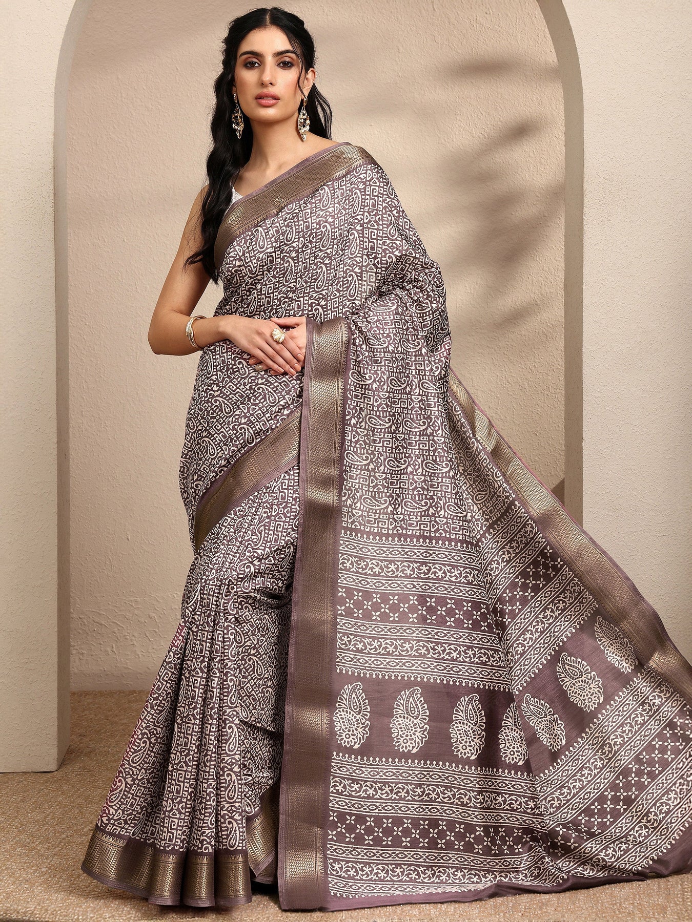 Mauve Paisley Printed Silk Blend Saree With Unstitched Blouse Piece