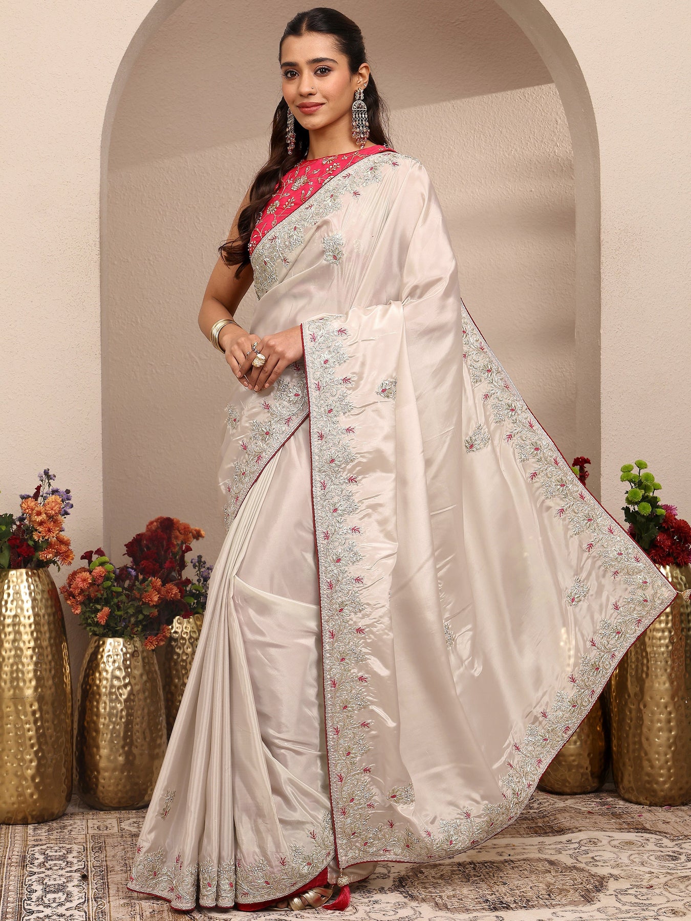 Grey Embroidered Silk Blend Saree With Unstitched Blouse Piece