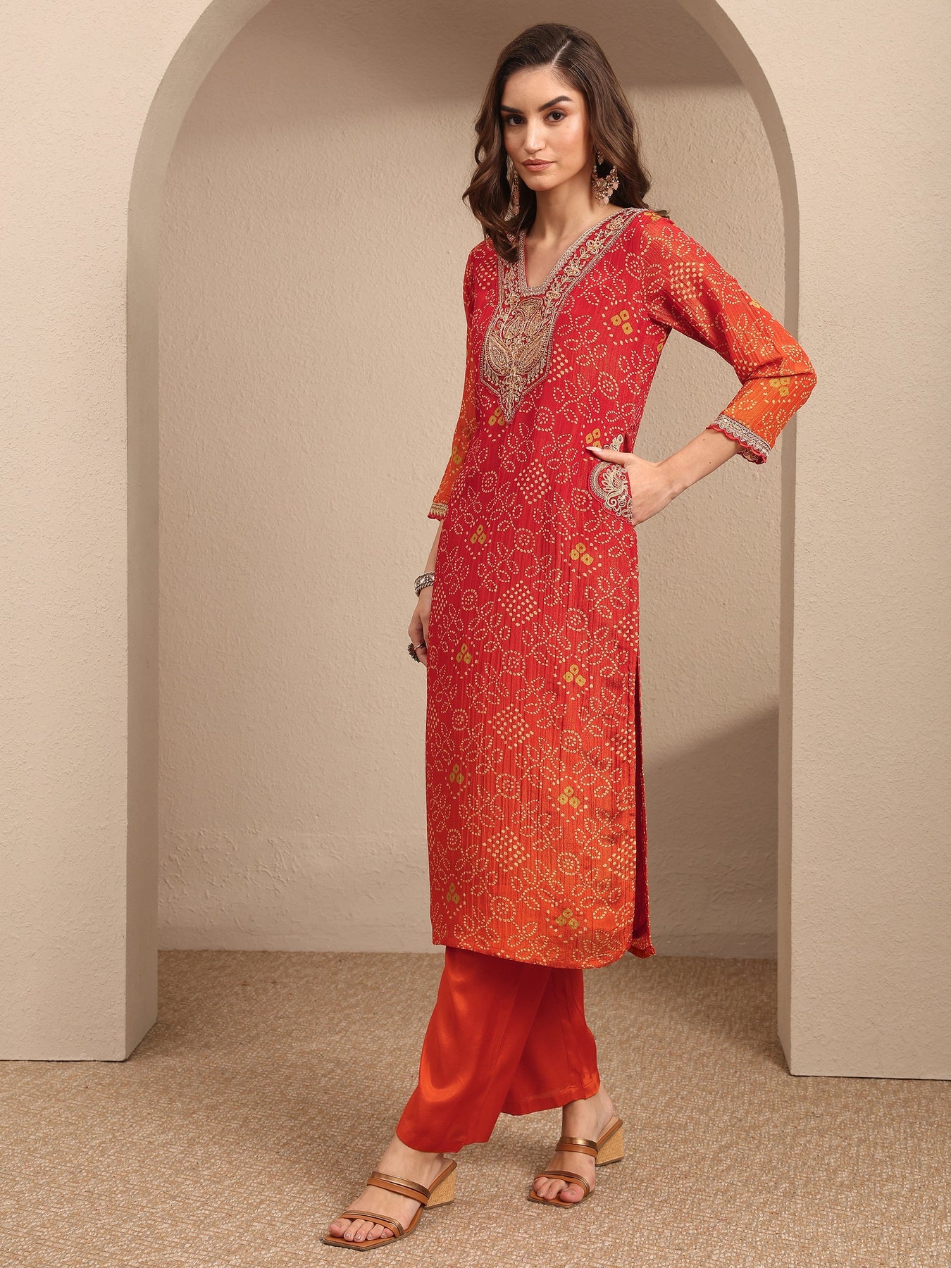 Our 3-piece orange silk blend kurta set features a straight-fit design with a V-neckline, regular sleeves, and statement yoke. Complemented with straight pants with a partially elasticated waistband and 2 pockets, and a dyed dupatta. Adorned with bandhani printed, this style is perfect for festive occasions.