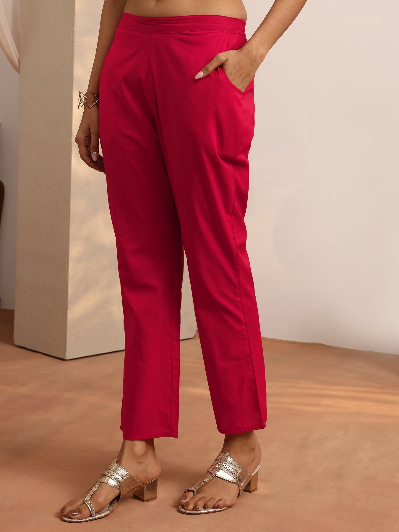 Our 3-piece red Cotton Straight-Fit Kurta Set features a V-Neckline, Regular Sleeves, and statement yoke. Complemented with Straight Pants with a Partially Elasticated waistband and 2 pockets, and a Printed dupatta. Adorned with ethnic motif printed, this style is perfect for Work Wear and Casual Wear.