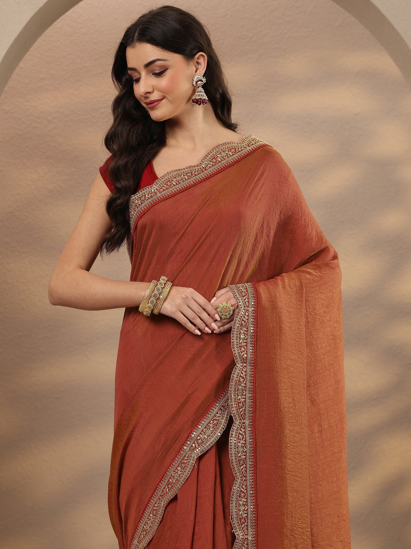 Our Rust Solid Sarees Silk Blend Saree Features Captivating Solid. Complemented With An Unstitched Blouse Piece. This Charming Saree Is Perfect For Festive Occasions.