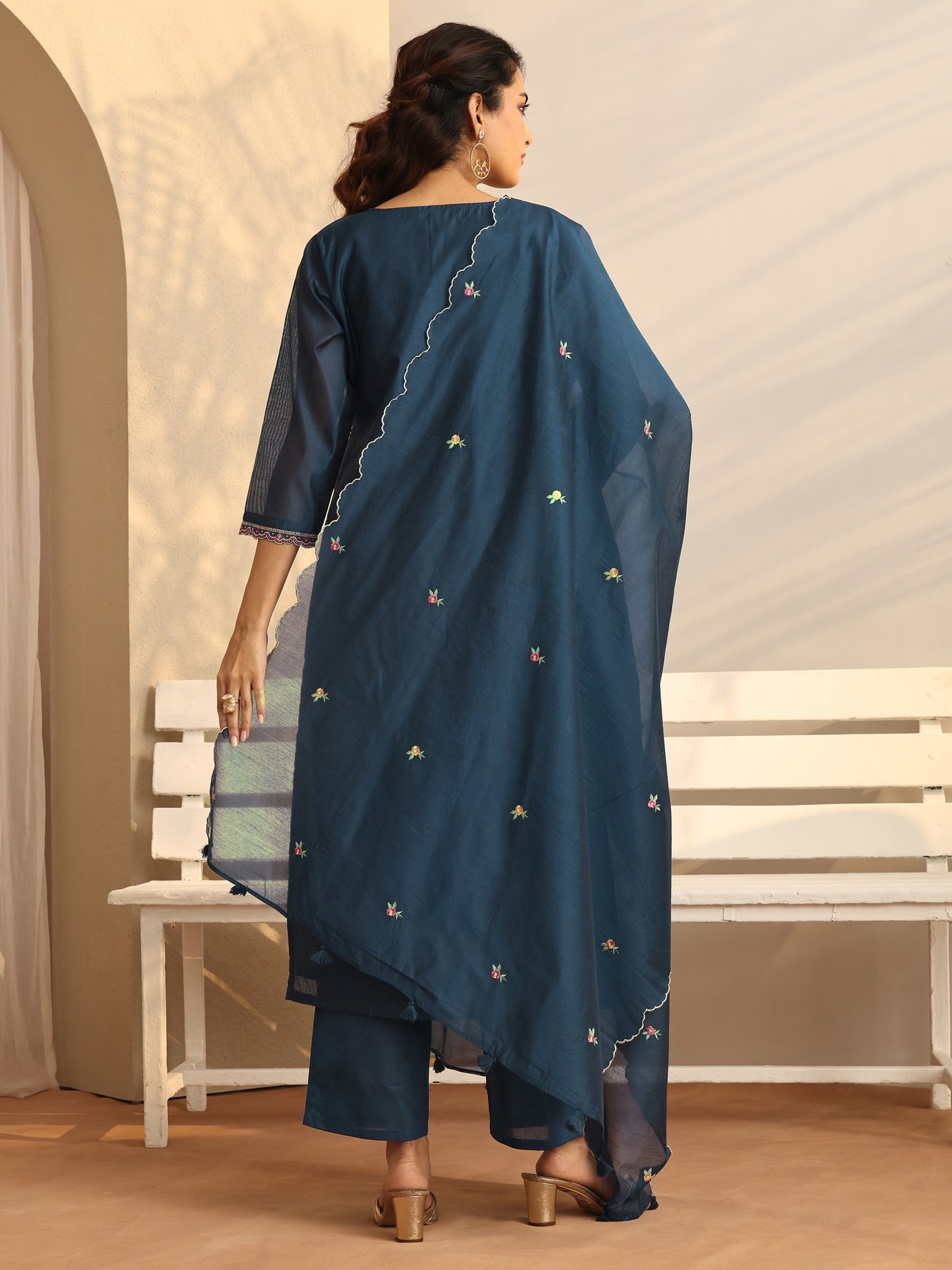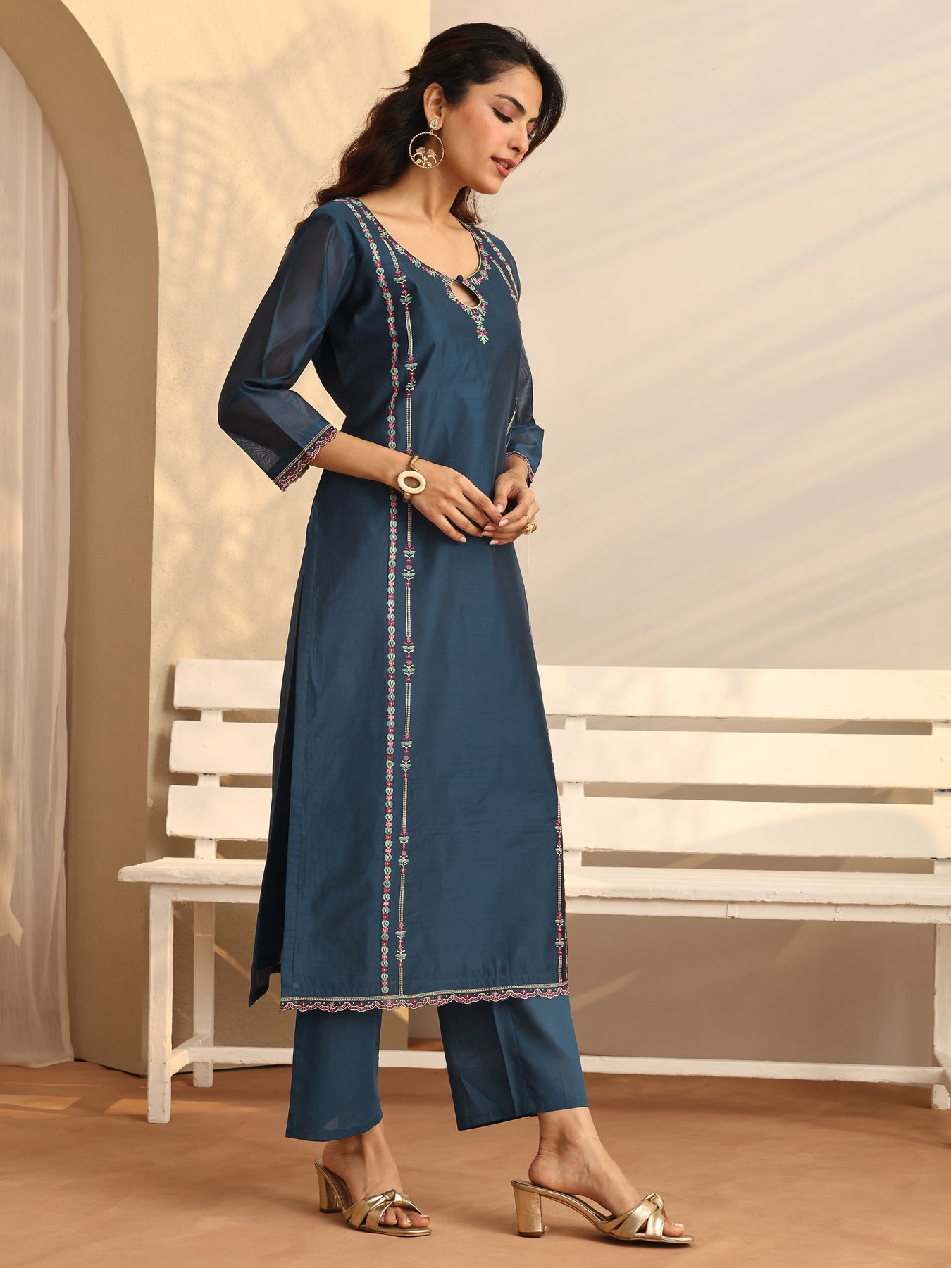 Teal Embroidered Silk Blend Straight Suit Set With Dupatta