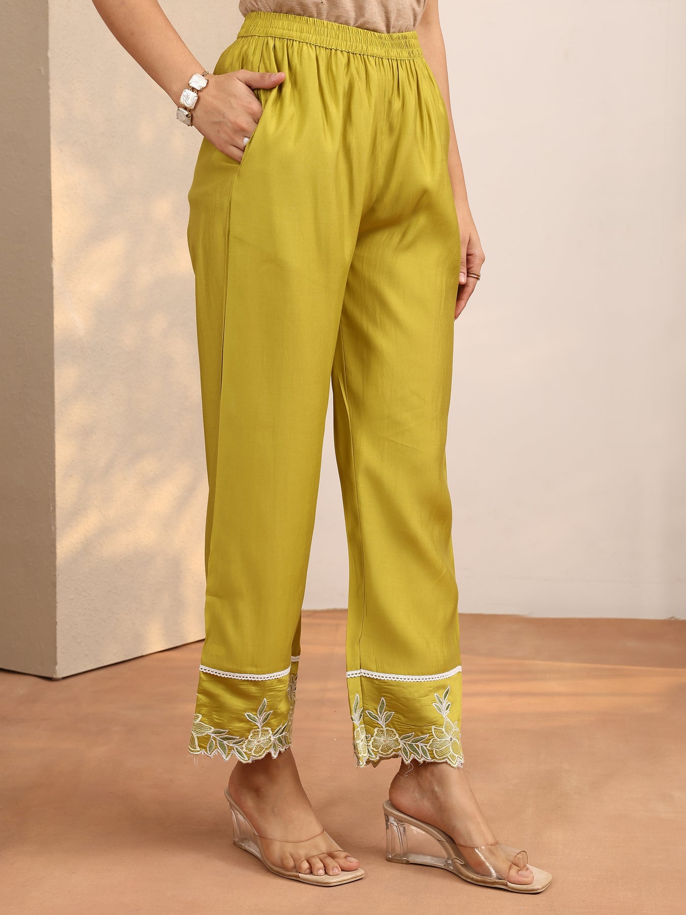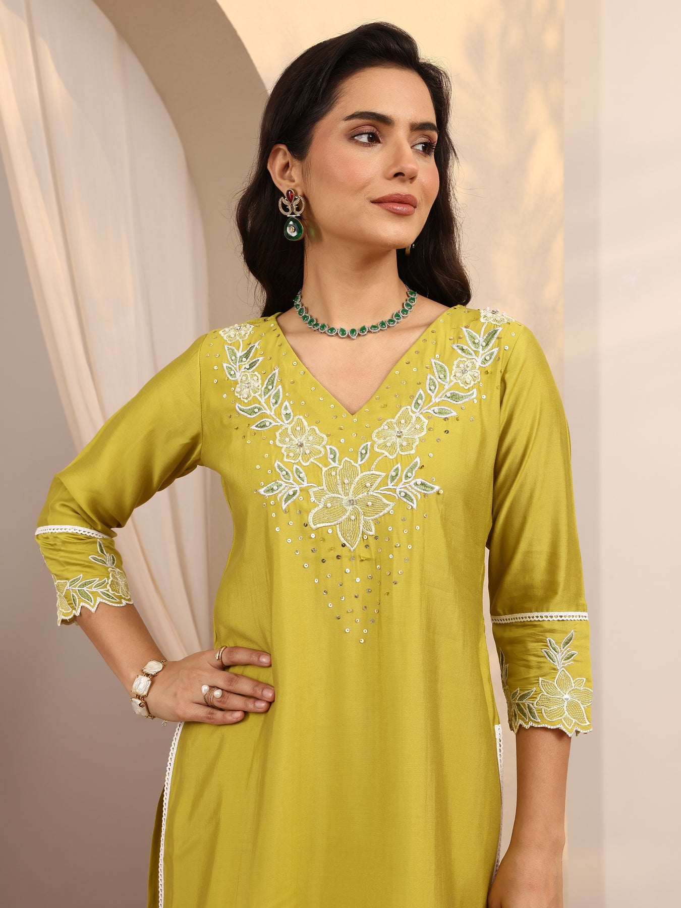 Our 2-piece green printed silk blend co-ord set features a Straight-fit Tunic with a V-Neck neckline and three-quarter sleeves. Complemented with matching Trousers with a Partially Elasticated waistband and 2 pockets. Highlighted with floral Embellishments, this style is perfect for Semi Festive occasions.