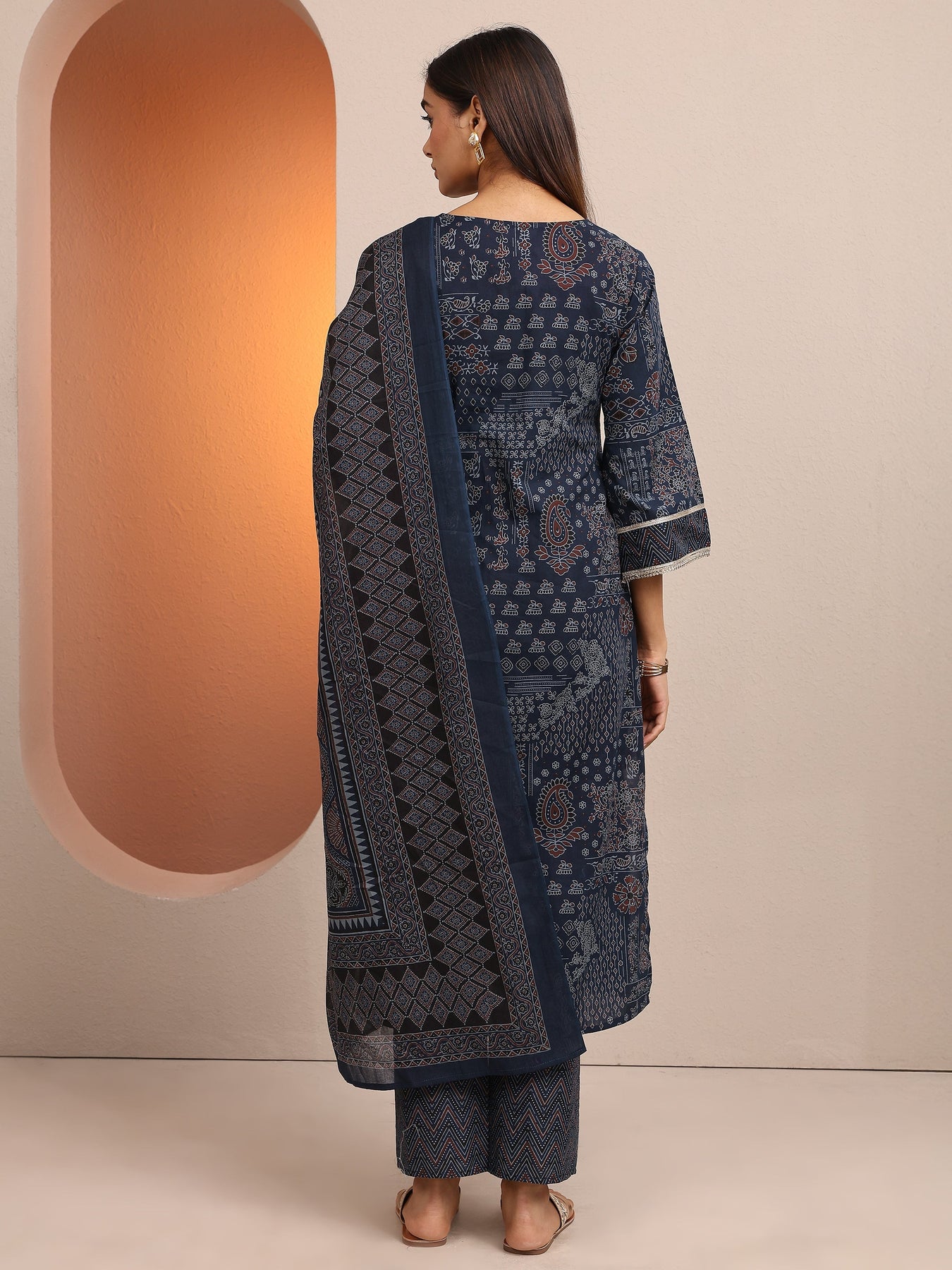 Blue Printed Cotton Straight Suit Set With Dupatta