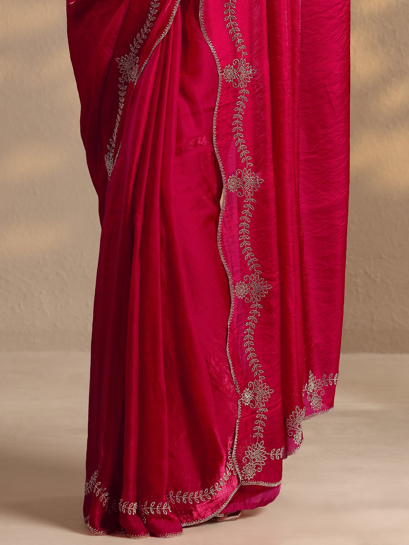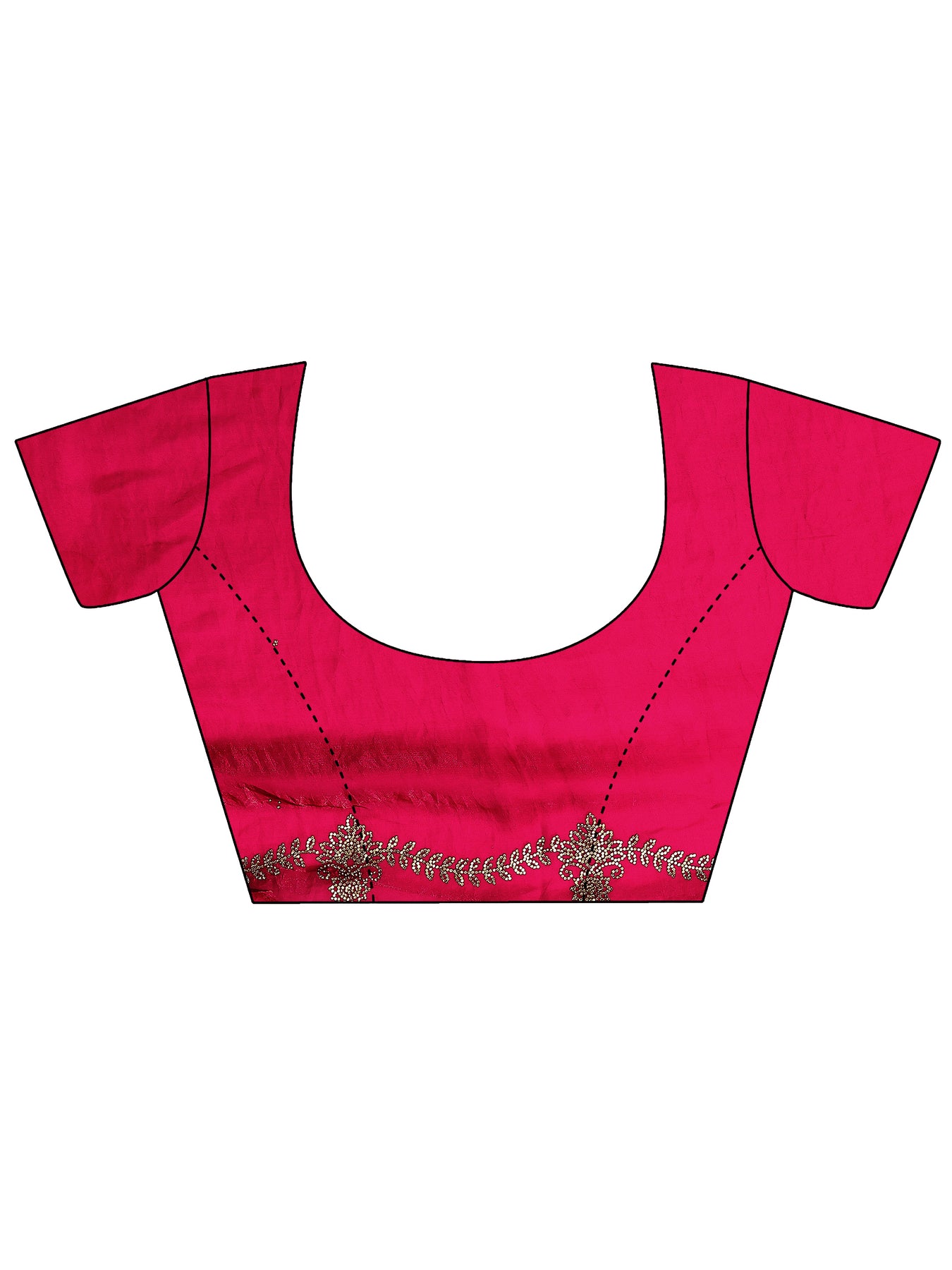 Our magenta silk blend saree features captivating solid. Complemented with an unstitched blouse piece. This charming saree is perfect for festive wear.