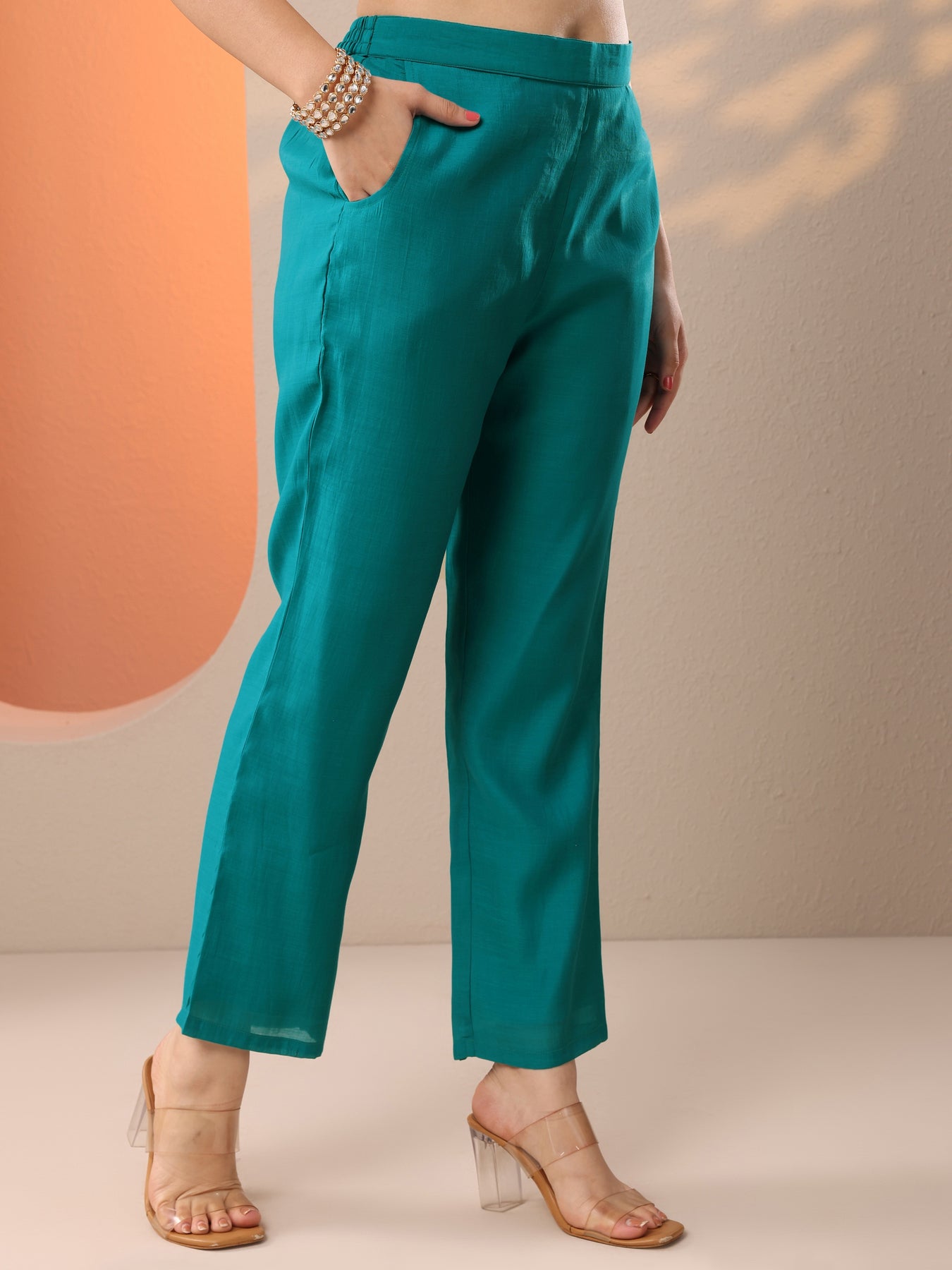 Our 3-piece Teal Silk blend Straight-fit Kurta Set features a V-Neckline, Regular Sleeves, and statement Yoke. Complemented with Straight Pants with a Partially Elasticated waistband and 2 pockets, and an Embroidered Dupatta. Adorned with Embroidered accents, this style is perfect for Festive occasions.