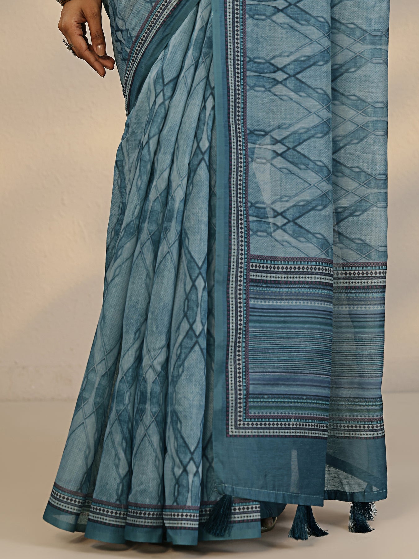 Blue Printed Silk Blend Saree With Unstitched Blouse Piece