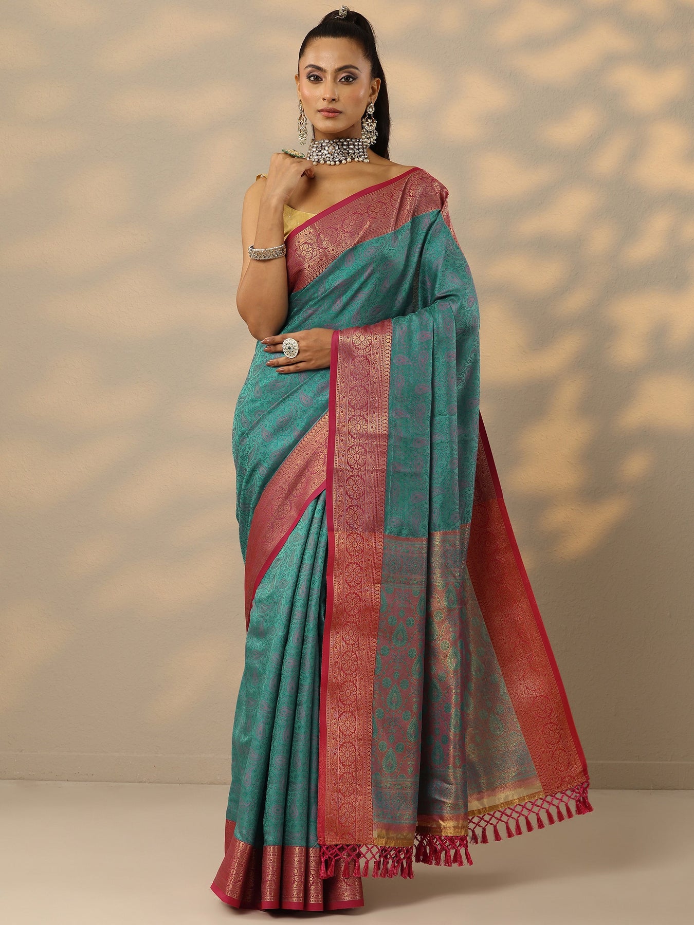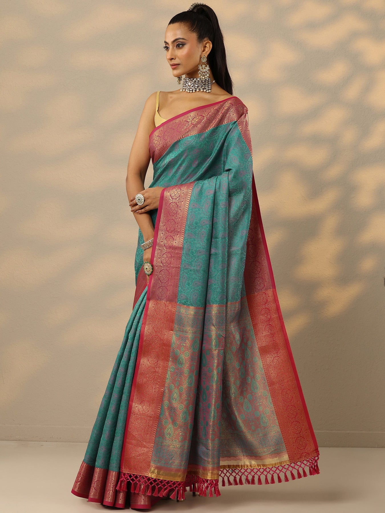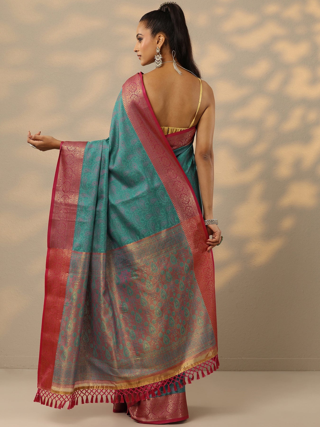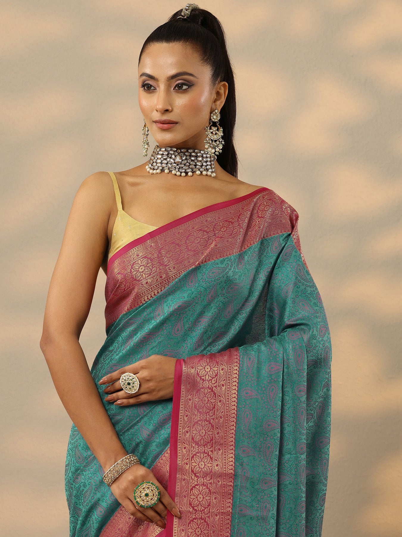 Our Teal Printed Silk Blend Saree Features Captivating Intricate Patterns. Complemented With An Unstitched Blouse Piece. This Charming Saree Is Perfect For Festive Occasions
