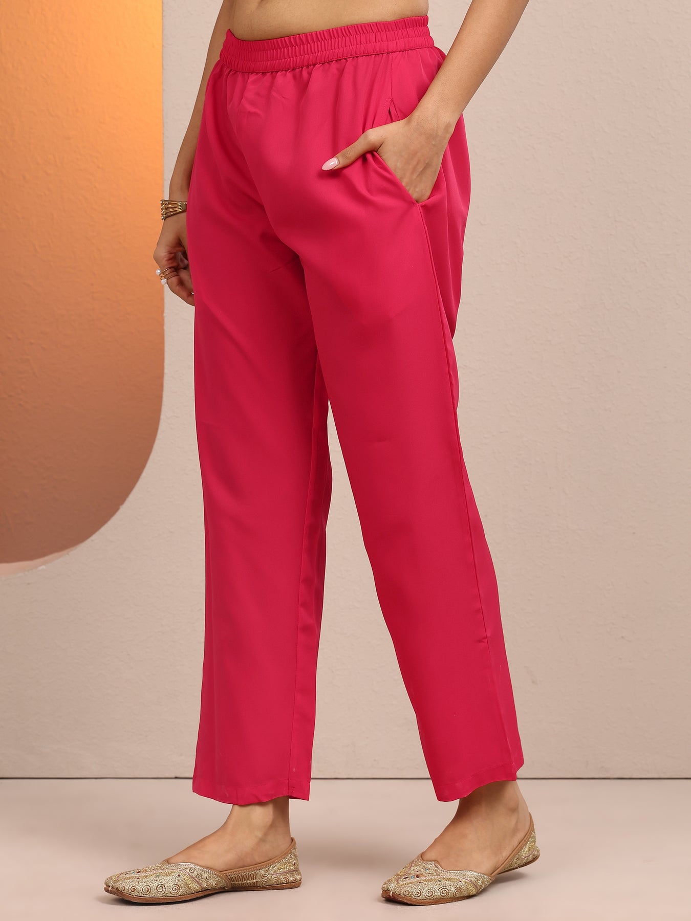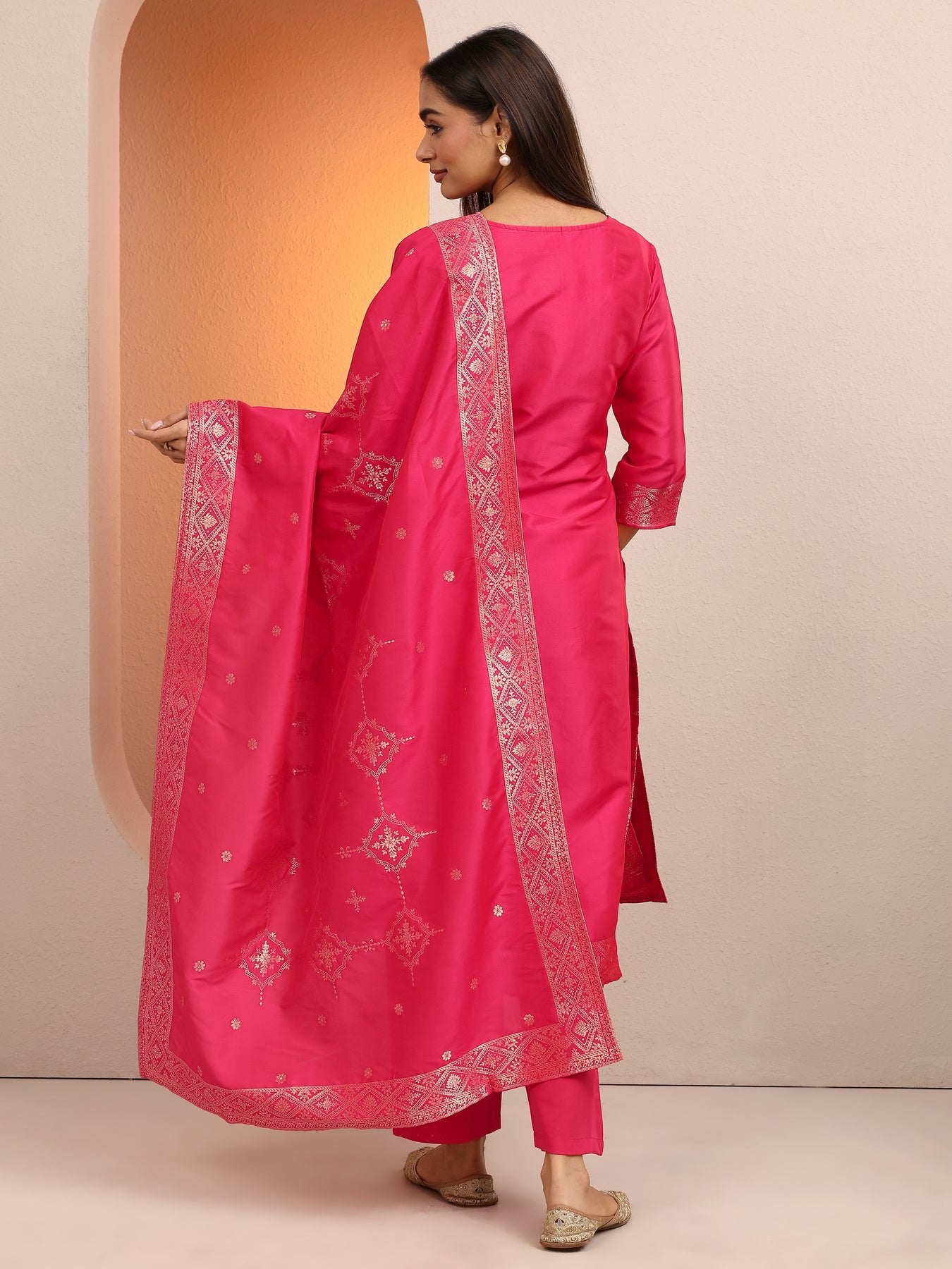 Our 3-piece Pink Silk blend Straight-Fit Kurta Set features a Round Neckline, Regular Sleeves, and statement yoke. Complemented with Straight Pants with a Partially Elasticated waistband and 2 pockets, and an Embroidered dupatta. Adorned with ethnic motif woven design, this style is perfect for Festive occasions.