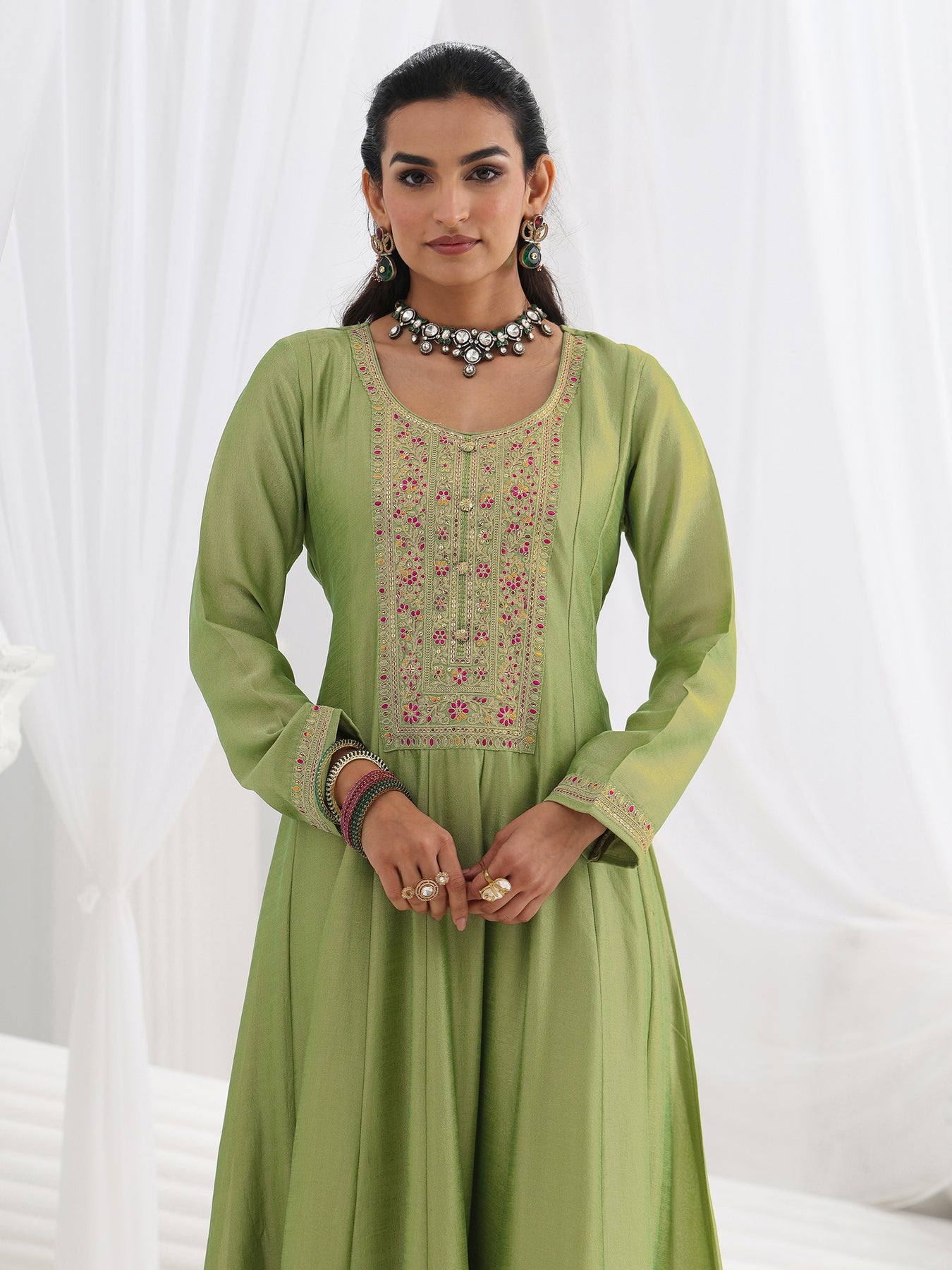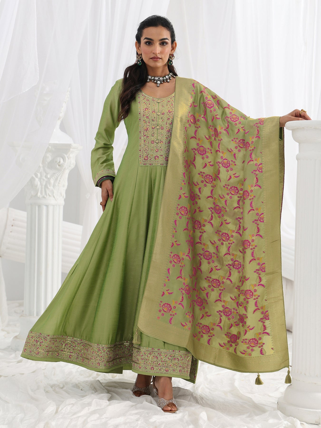 Green Embroidered Silk A-Line Gown With Dupatta
