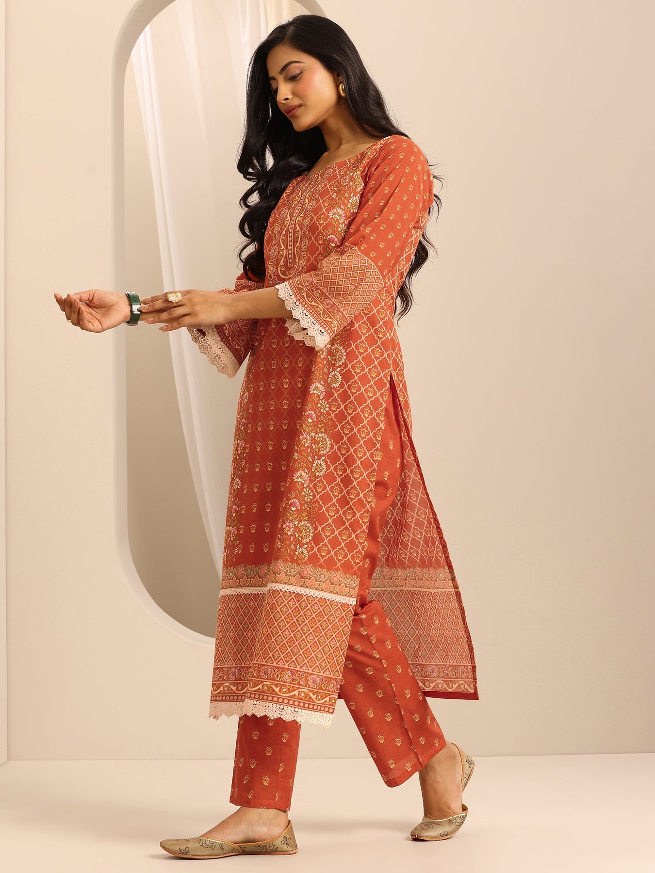 Orange Printed Cotton Blend Straight Suit Set With Dupatta